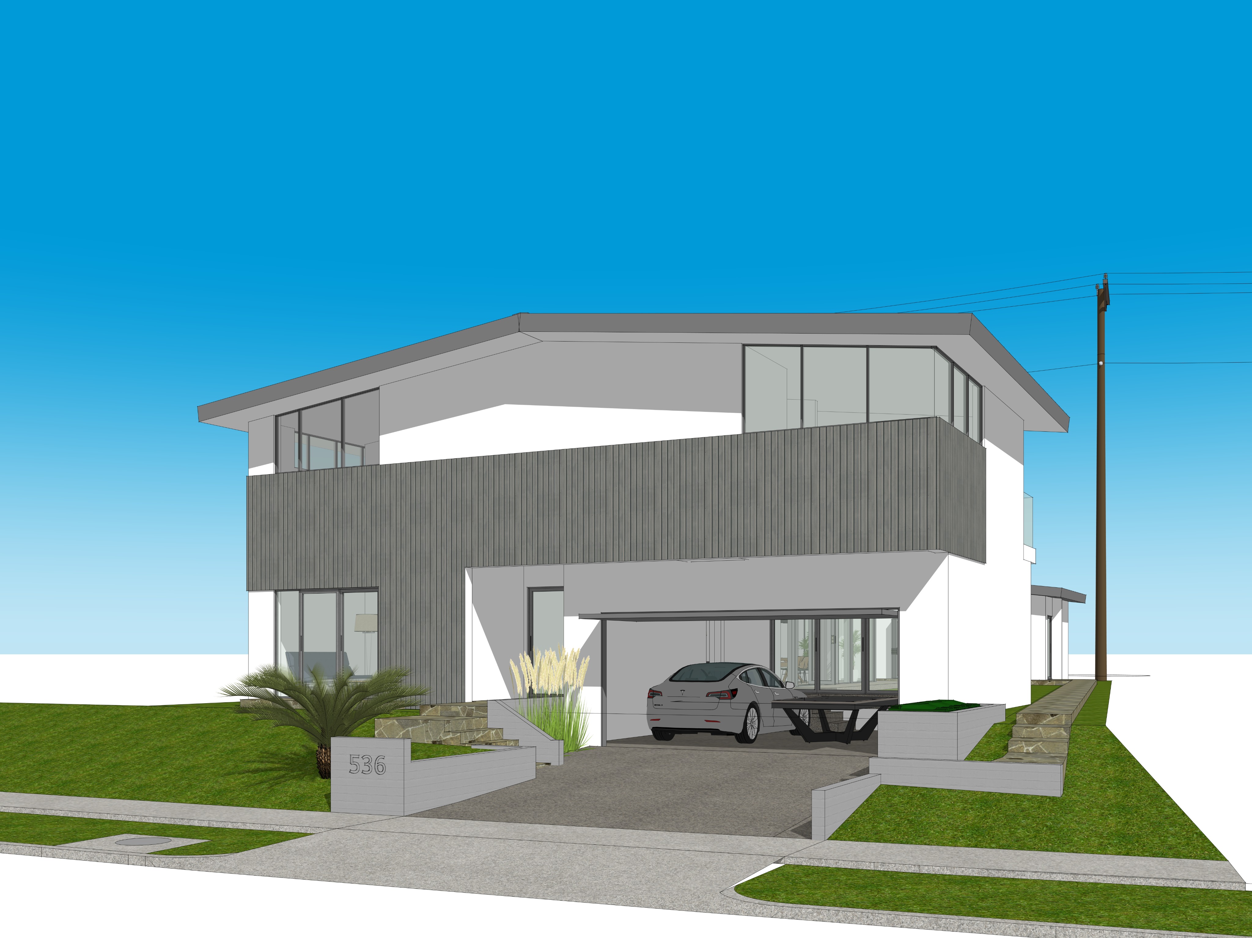 evening view lights on inside the house add california wild grasses and flowers to the landscape add grass in the the yard space enhance the glazing materials add some palms and trees adjacent to the house on the left and right sides of the view add some lights in the planting areas use the perspective view from the source image make the vertical wood siding material looks like old reclaimed wood
