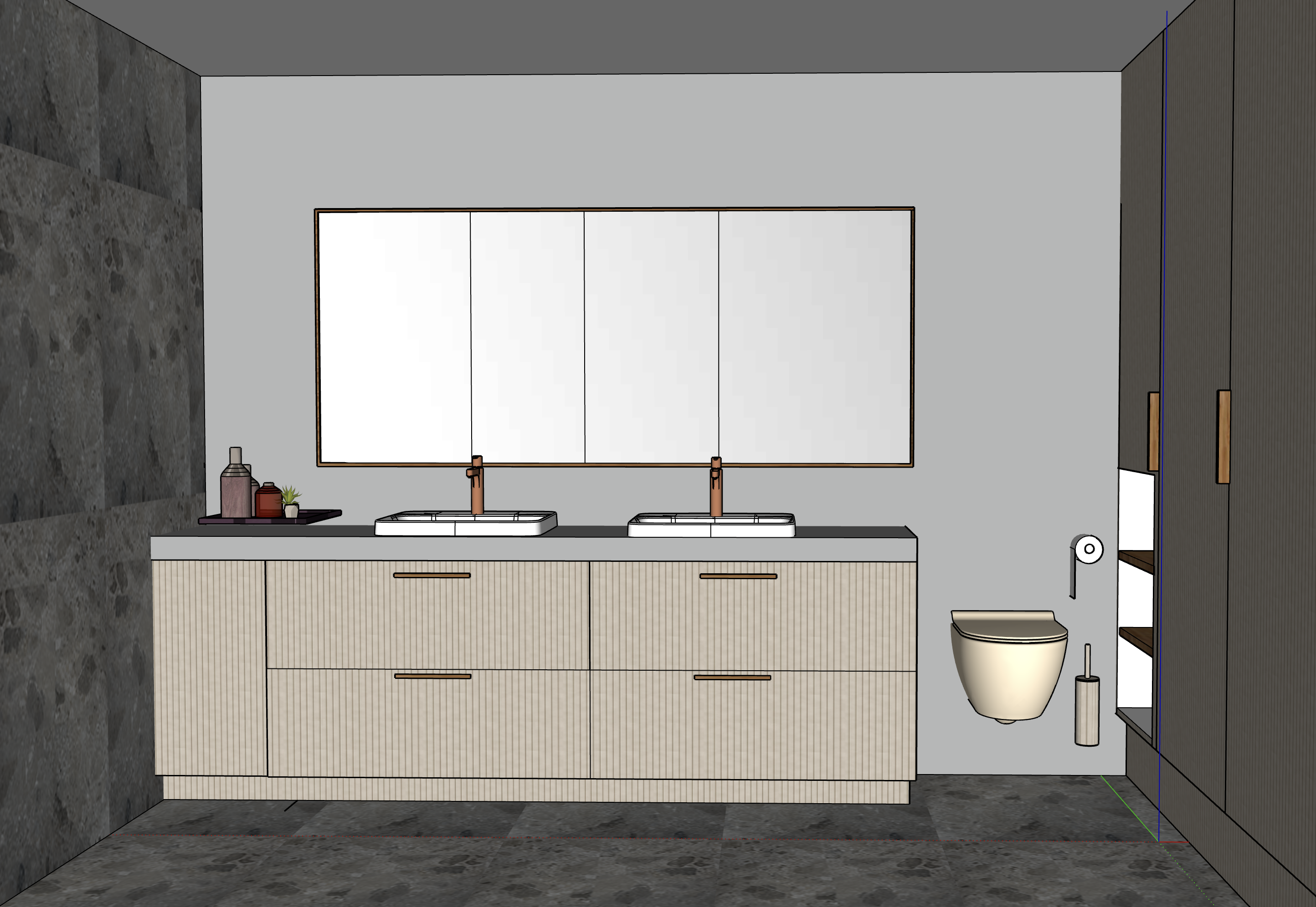 follow the image that is made with a cabinet on the right and open shelves no widows put a luxurious and serene bathroom featuring a mirror with a bronze border and terrazzo grey tyles like image soft big size light grey tiles behind the mirroir and bronze copper fixtures the toilet is beige complemented by a big stone terrazzo floor like the image double vanity is adorned with grey top countertops and warm grey beige ribbed cabinets accented by walnut wooden hand hardware the atmosphere is calm