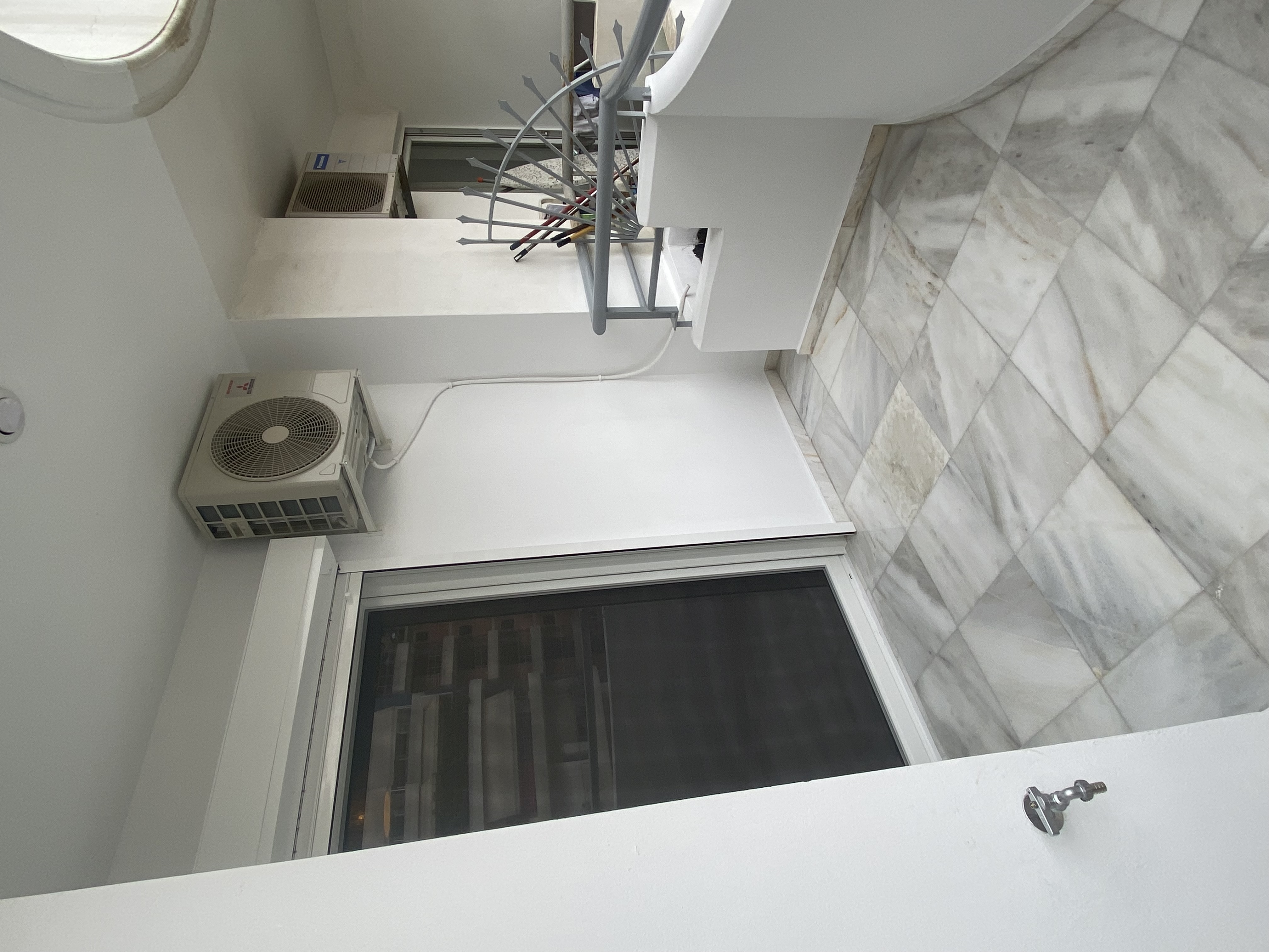 enhance this image in a professional real estate photography style while preserving the original structure materials and layout remove all temporary and unwanted objects from the balcony including paint buckets tools wooden boards and any construction related items the space should appear clean empty and ready for use keep all architectural elements exactly as they are including flooring walls railings windows and ceiling do not change or redesign any materials enhance the overall look to feel more high end and inviting by improving lighting balance clarity and color tones the result should feel bright clean and premium like a finished property listing improve the marble floor appearance only by enhancing clarity reflections and cleanliness do not change the tile pattern color or texture enhance natural light coming from outside to create a soft airy atmosphere avoid artificial lighting effects correct perspective and straighten vertical lines for a professional look do not add furniture or new elements keep the space minimal clean and realistic