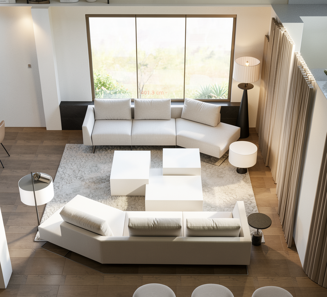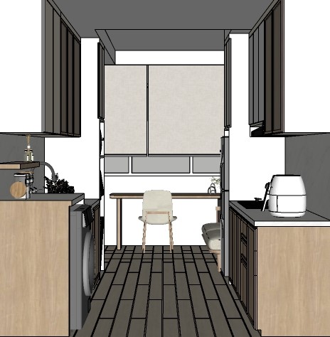 render snyata mungkin vinyl krim tanpe merubah bentuk dan material plafon puith fabric kursi warna beigi lemari frame kayu warna kayu japandi style