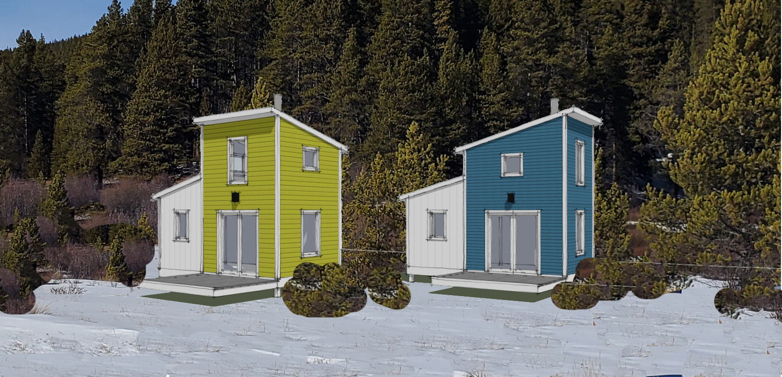 orange and blue cabins painted lap siding metal siding at forests edge colorado landscape snow on ground snowy path to front decks large moose in front yard