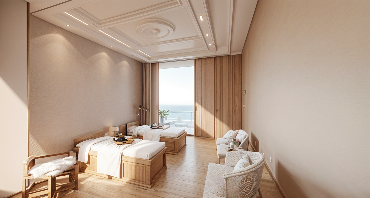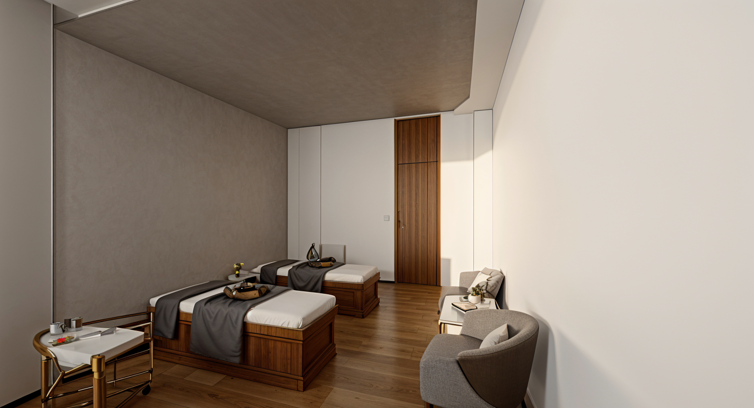isometric architectural complex depicted in a serene urban landscape render detailed four story buildings with textured facades in light grey and concrete details accentuate the setting with a warm beige pavement and pathways include a small parking area with cars in subtle grey tones surround the buildings with carefully landscaped greenery in varying shades of green for contrast soft ambient light casts gentle shadows creating a peaceful and modern atmosphere