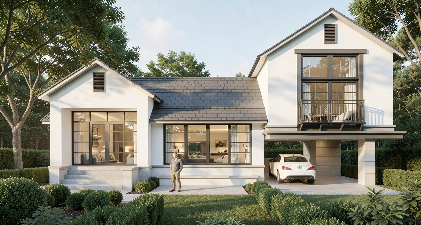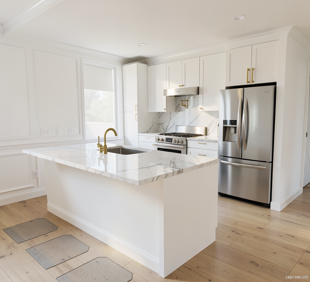 render this kitchen with white color cabinets black bar pull hardware and black plumbing fixtures stainless steel appliances quartz countertop and backsplash with very light grey vein floor to be light oak walls to be sheetrock painted white and base molding to be glossy white