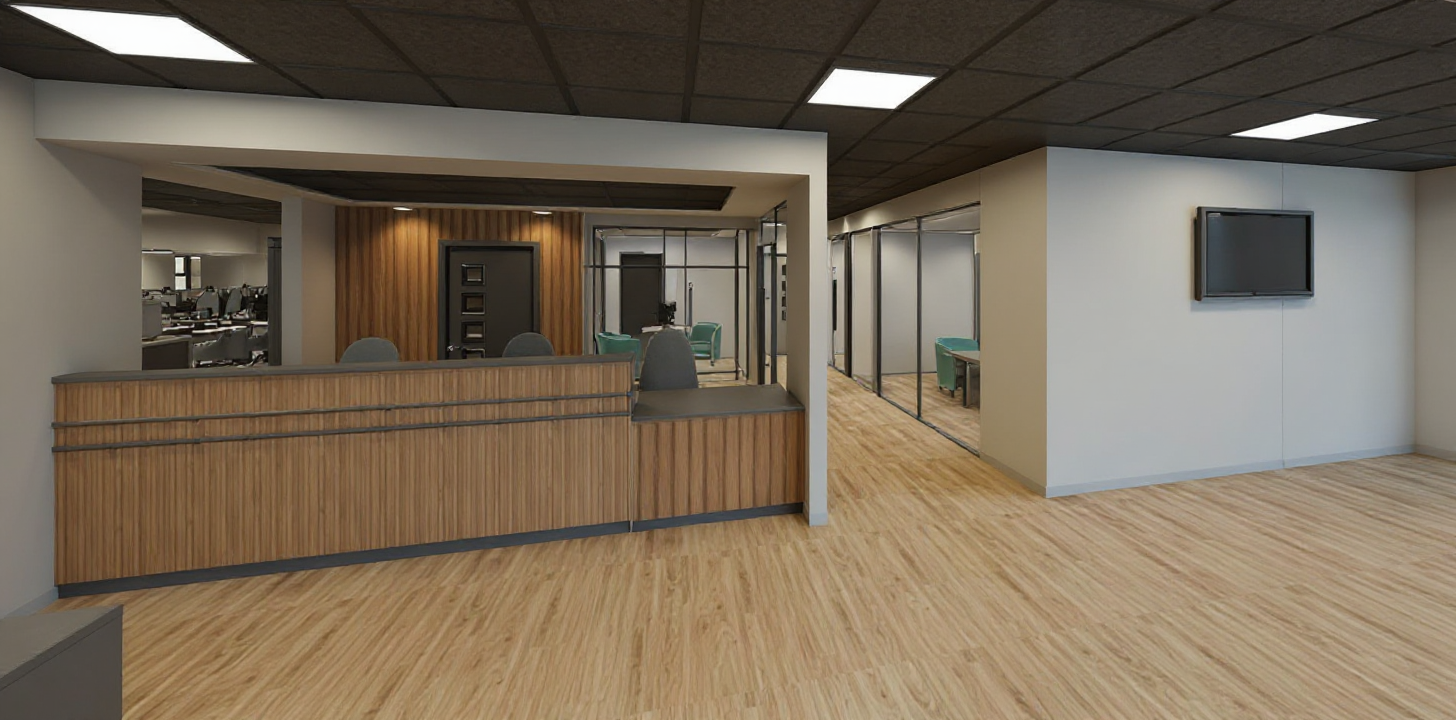 render this reception area light oak timber flooring light grey painted plaster walls glazed partition screens and doors to rooms off corridor light timber slat to reception desk and timber slat to wall behind reception desk suspended ceiling is to be of dark charcoal color with square lights in ceiling grid of full square in every third grid tile add some plants vegetation throughout the space on external windows add vertical blinds add some fabric coloured seating in the area near the windows as this is a waiting area