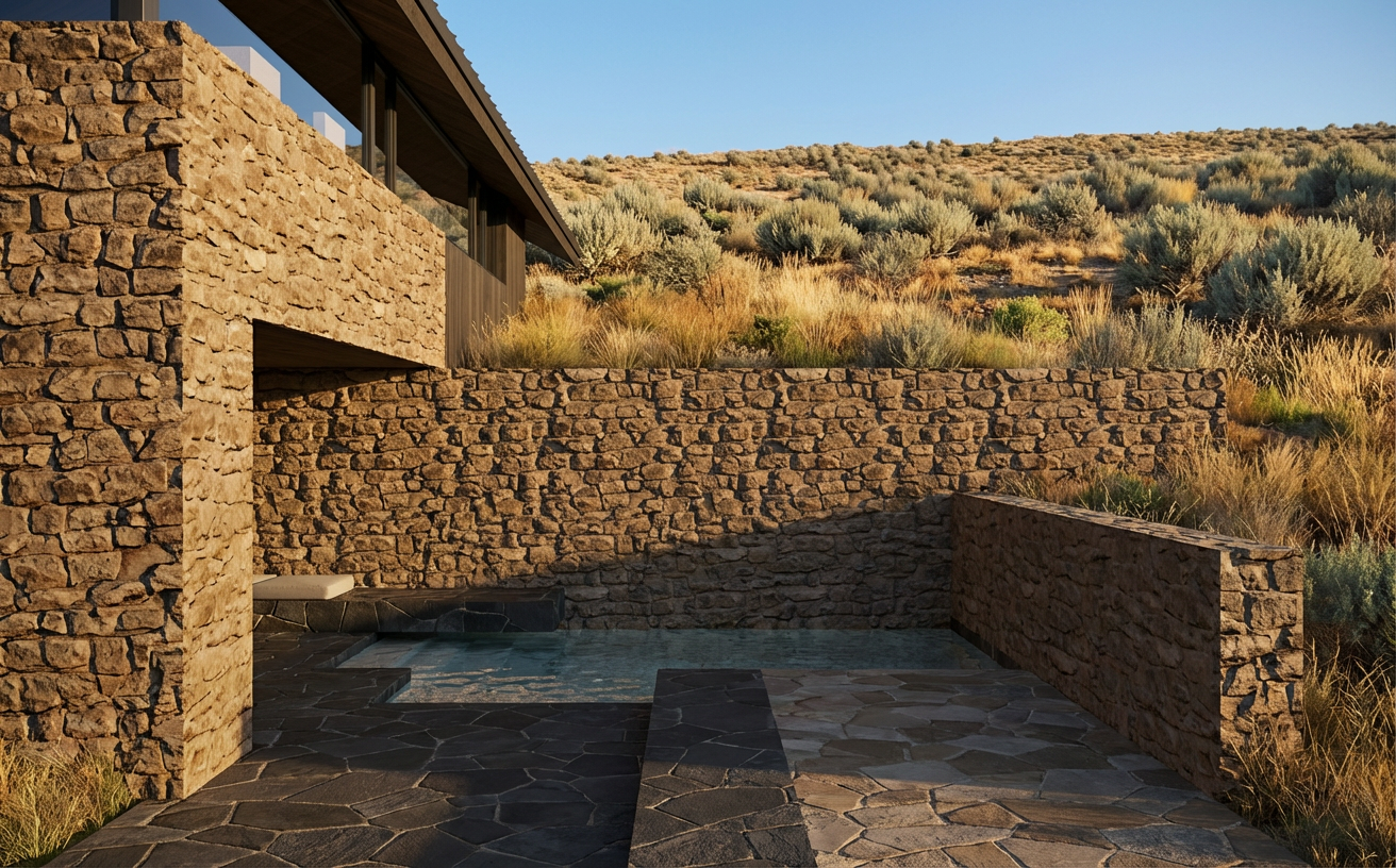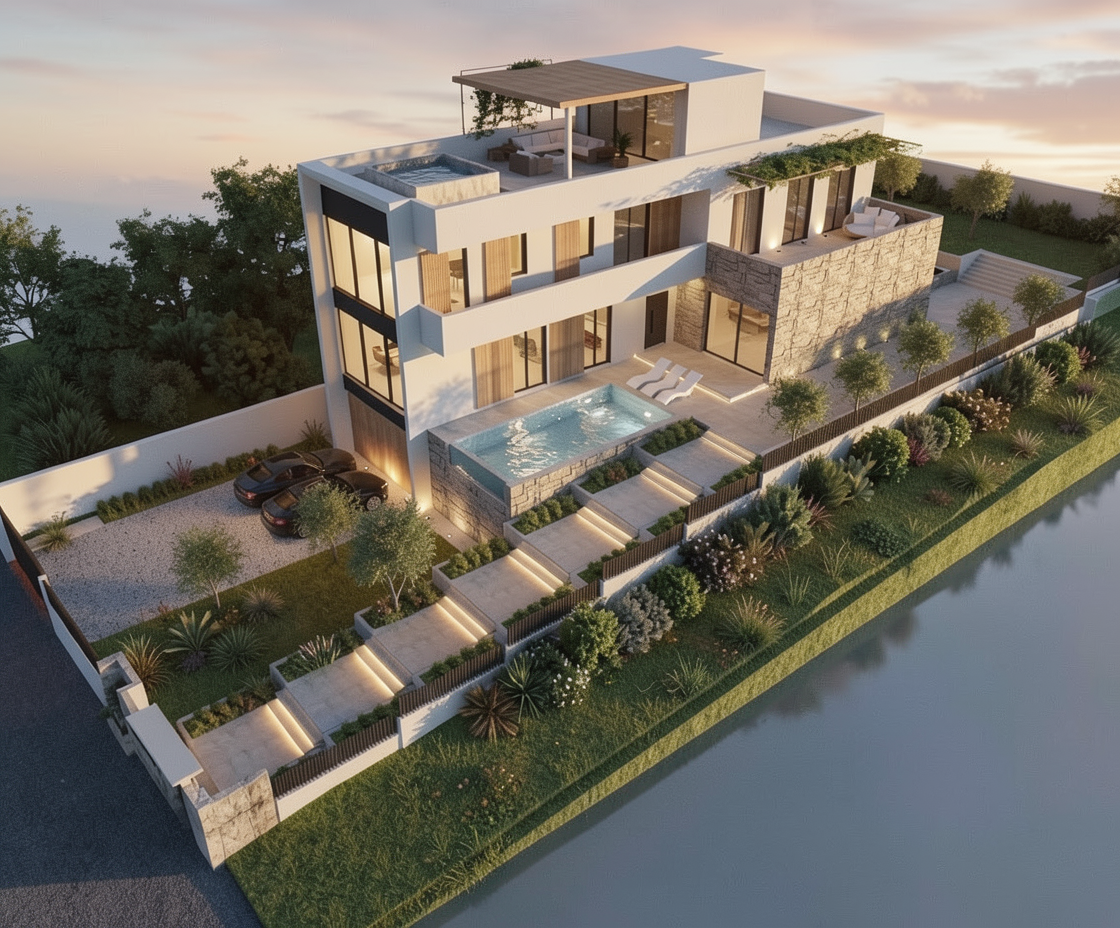 have a light warm external timber paneling on the walls have the roof and trim colours be surfmist with australian native plants in the garden