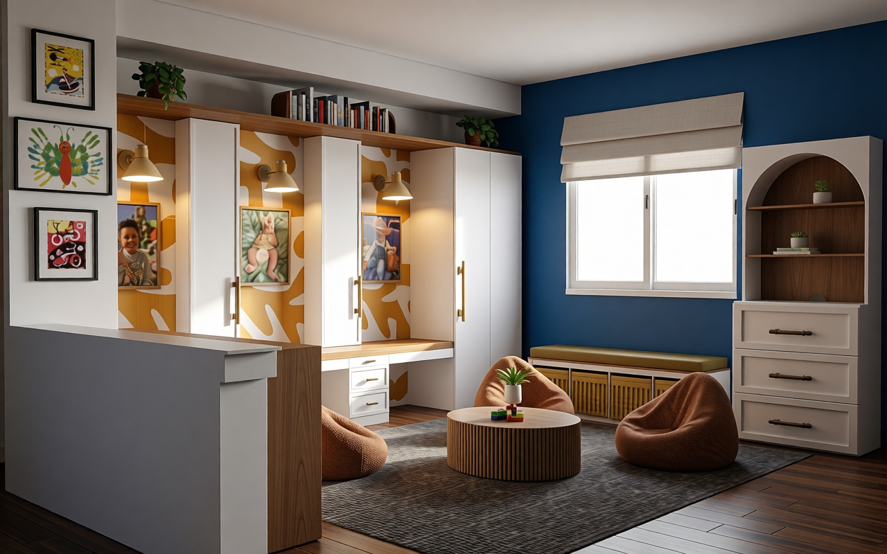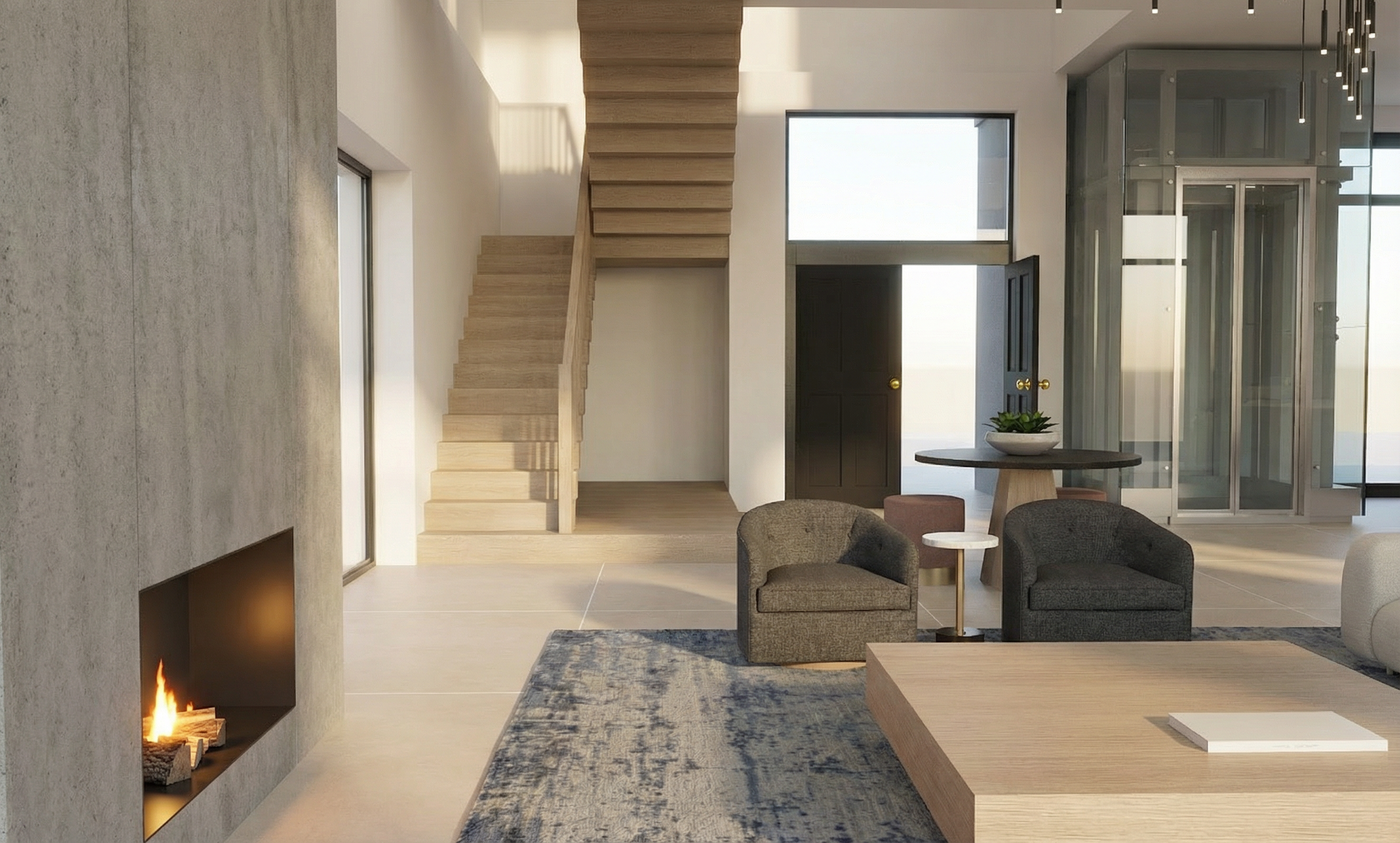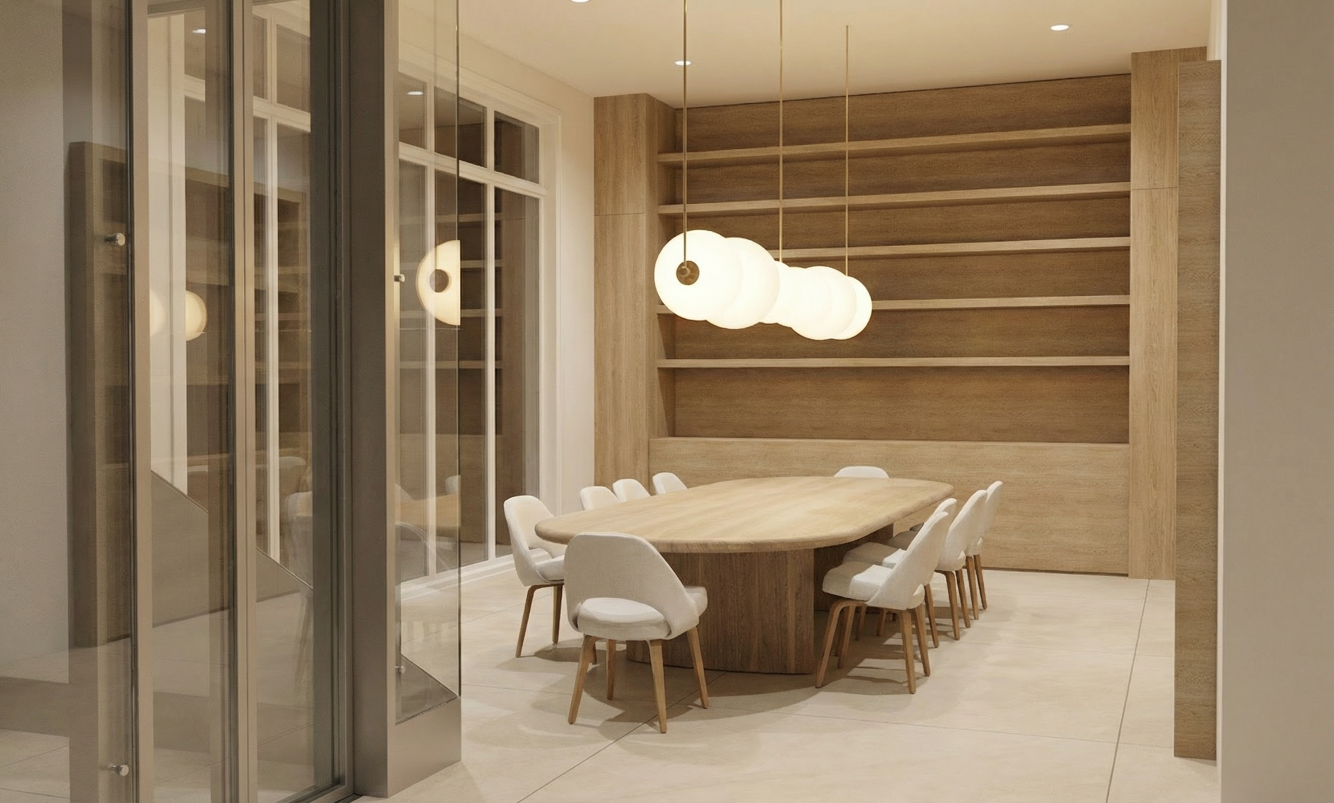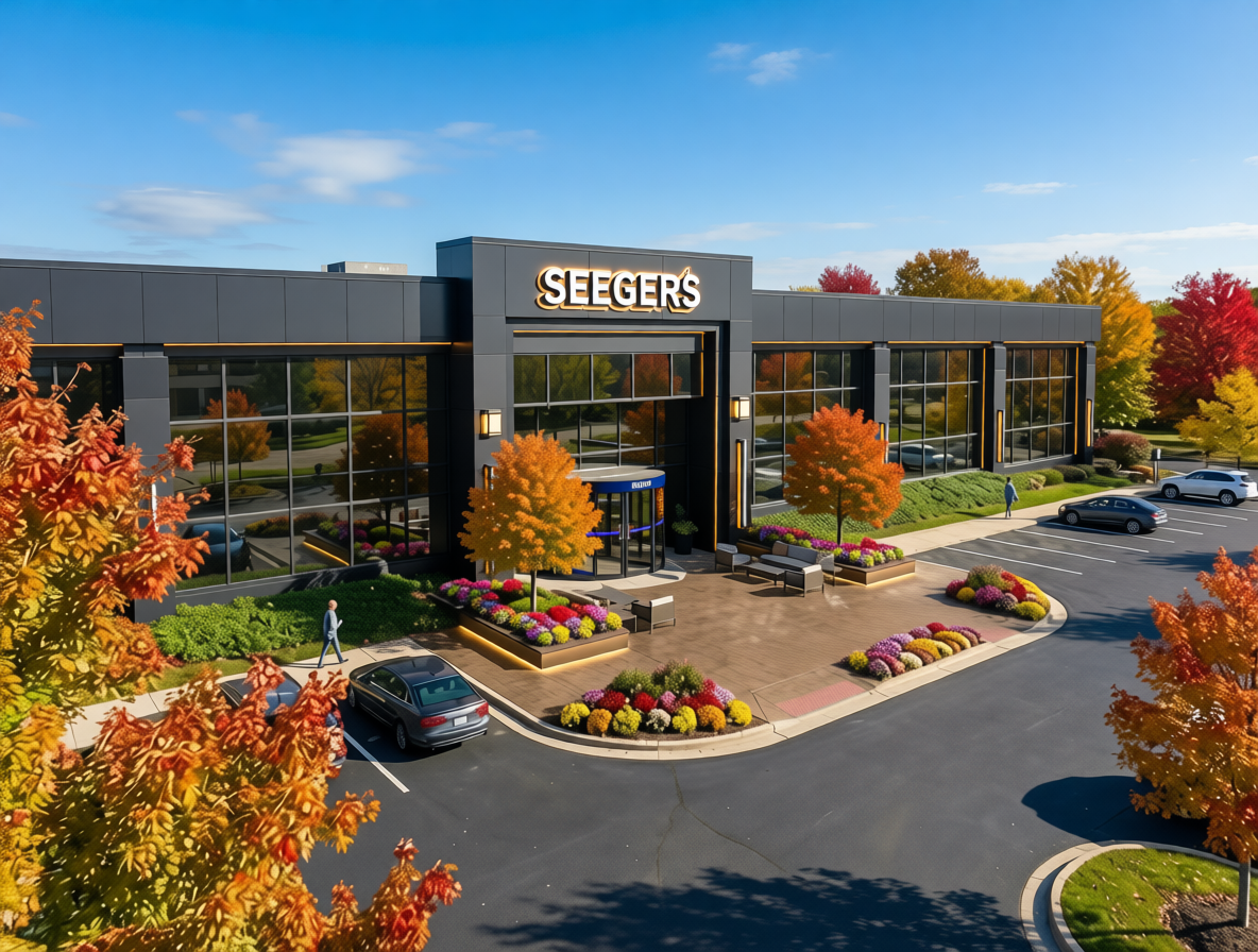 a modern two story office building featuring a long facade dominated by large reflective glass windows and dark aluminum mullions the prominent vertical columns painted dark gray with light fixture at the bottom of each column lighting up building flat roof parapet with dark gray paint and soft led lighting visible around the main entry only replace the swing entry doors with revolving entry no canopy at entry flanked by colorful flowers the structure is set against a vibrant blue sky and surrounded by lush green grass and autumnal trees displaying vivid red and orange foliage the atmosphere is clear and sunny with bright light illuminating the scene and casting soft shadows across the expansive very black asphalt parking area where a few cars are parked and pedestrians are walking remove free standing seegers signage add signage of seegers at the top center of building entry with led light at its back of the signage make the entry pavement narrower bench on both sides area add two ornamental trees one on each side of the entry make the long modern light fixture on both side of the entry only on light fixture at the rest of columns