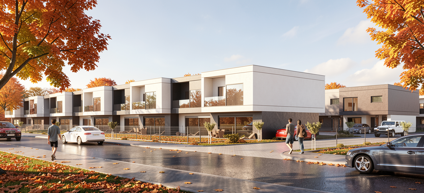 create a photorealistic view do not change the shape of the buildings do not add any inscriptions do not change the inscriptions of numbers and registration plates summer do not change the shapes or divisions of buildings