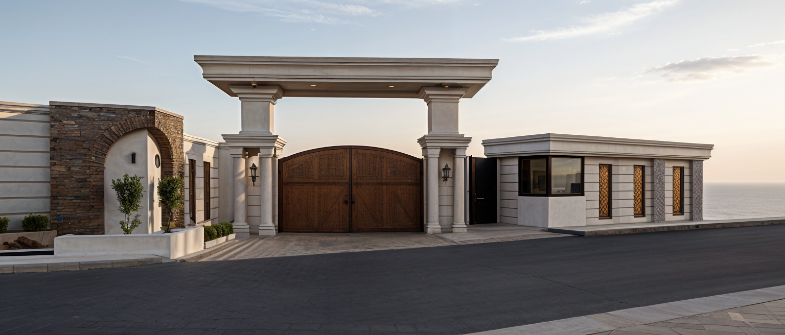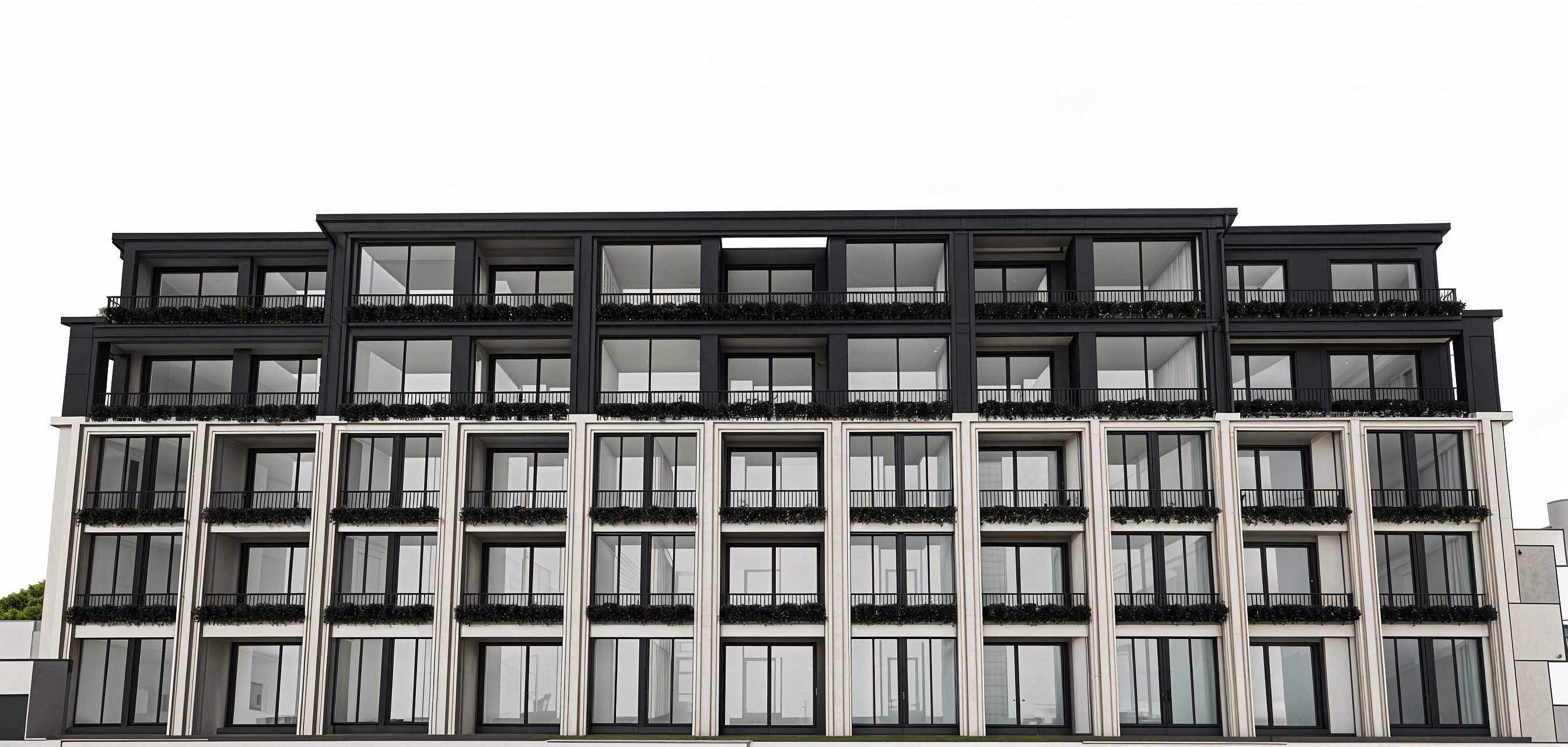 residential building featuring clean lines and a minimalist facade emphasize the sleek stone and glass materials punctuated by black framed windows and elegant balconies richly landscaped balconies set against a serene urban environment include surrounding greenery and low shrubs capture the soft diffuse natural light of an overcast day creating subtle shadows use a low angle perspective to highlight the architectural symmetry and texture mimicking a 24mm lens for a wide yet intimate view of the structure