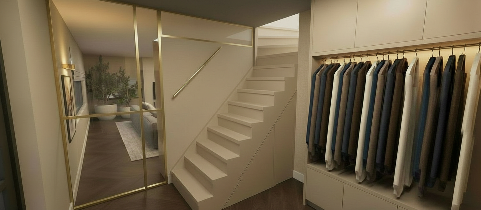 make the handrail the edges of the steel doors and the wall lighting bronze