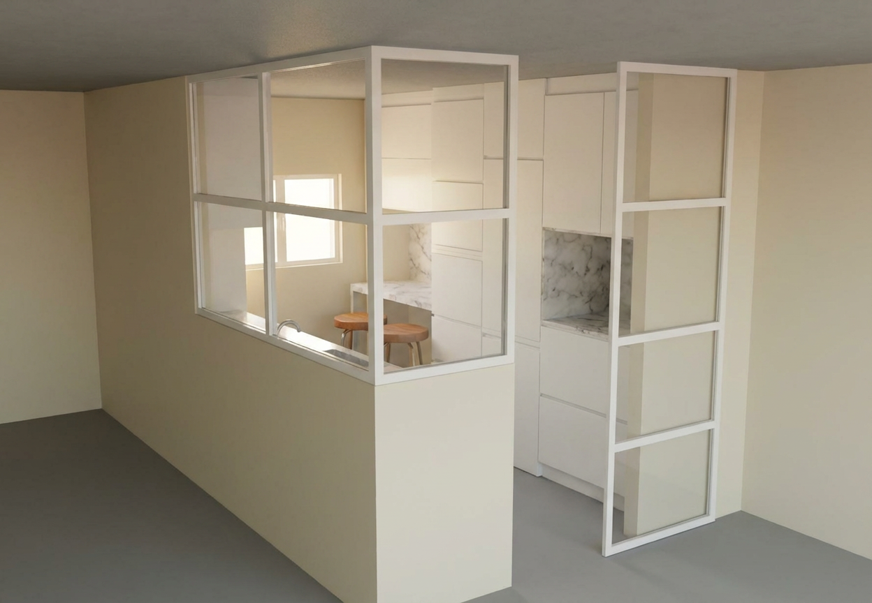 render photo realistic keeping finishes and structure the same standard office grid ceiling stainless steel fridge on far right