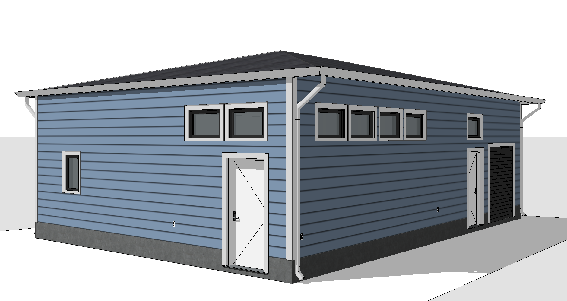 render this garage in a backyard with grass and trees use the finishes as reference and reflection in windows no fence on the left side