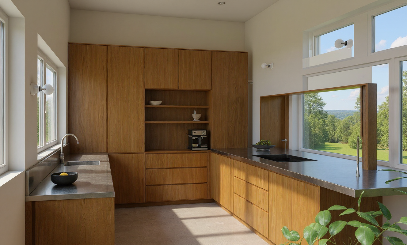 front view of a modern two story house with a mix of stone and wood siding roof with grey shingles upper sections of the house in soft cream and light grey tones with contrasting dark grey window frames front door in rich walnut brown stone sections in warm beige and grey lush green lawn and colorful flowers surrounding the front bright sunny atmosphere with a clear blue sky warm welcoming vibes