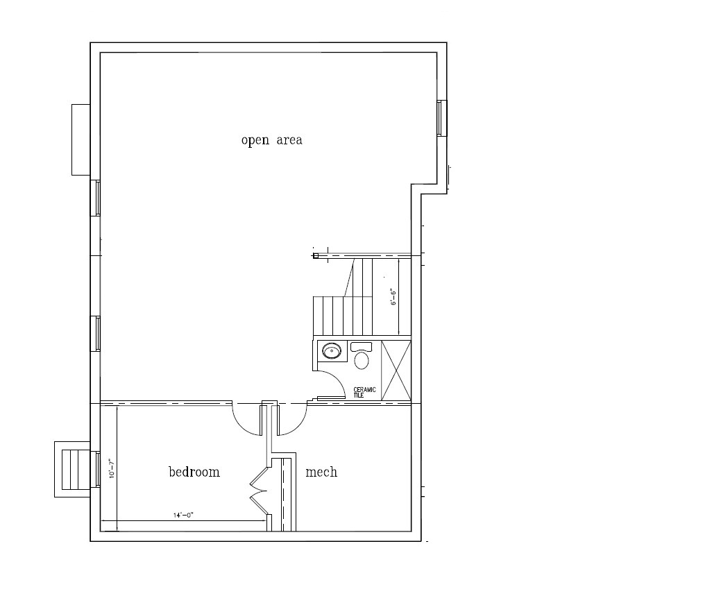 render a modern architectural floor plan highlighting an expansive open living area use soothing neutral tones like soft beige for walls and light gray accents with white for doors and trims the bedroom should exude warmth with earthy tones like gentle taupe and soft olive green create a sleek contemporary bathroom with glossy white ceramic tile and brushed steel fixtures the entire space should feel airy and inviting filled with natural light and a touch of greenery creating a calm and harmonious atmosphere