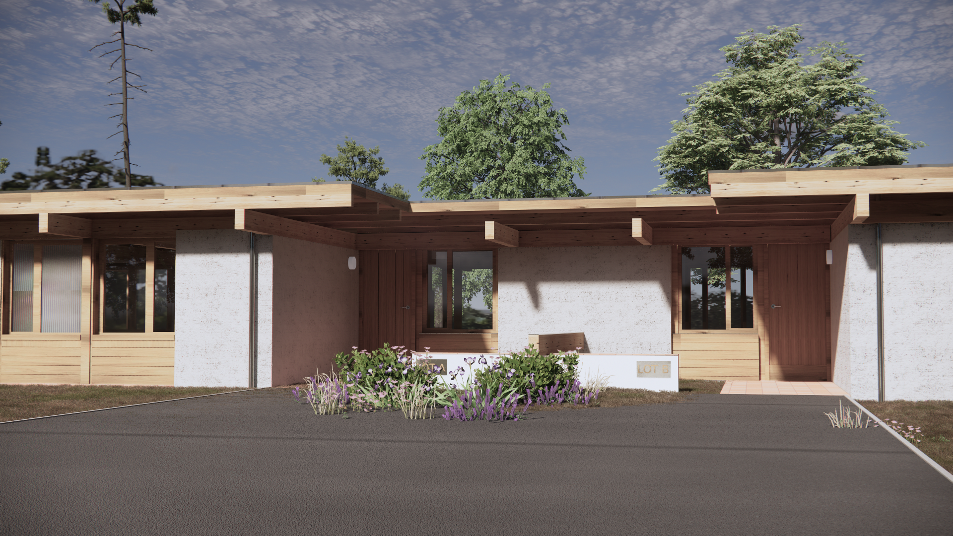 render a photorealistic 3d perspective of this house reference the current material style just enhance them concrete walls pine wood beams pine wood windows red stone floor eep model geometry the same windows doors roof walls make a lush vegetation that looks french oceanside without flowers do not change the view only enhance the current materials and make the landscape nicer vegetation detailed textures in the wood siding the driveway and glass reflections and a vibrant clear sky render in hyper realistic architectural visualization quality 8k resolution