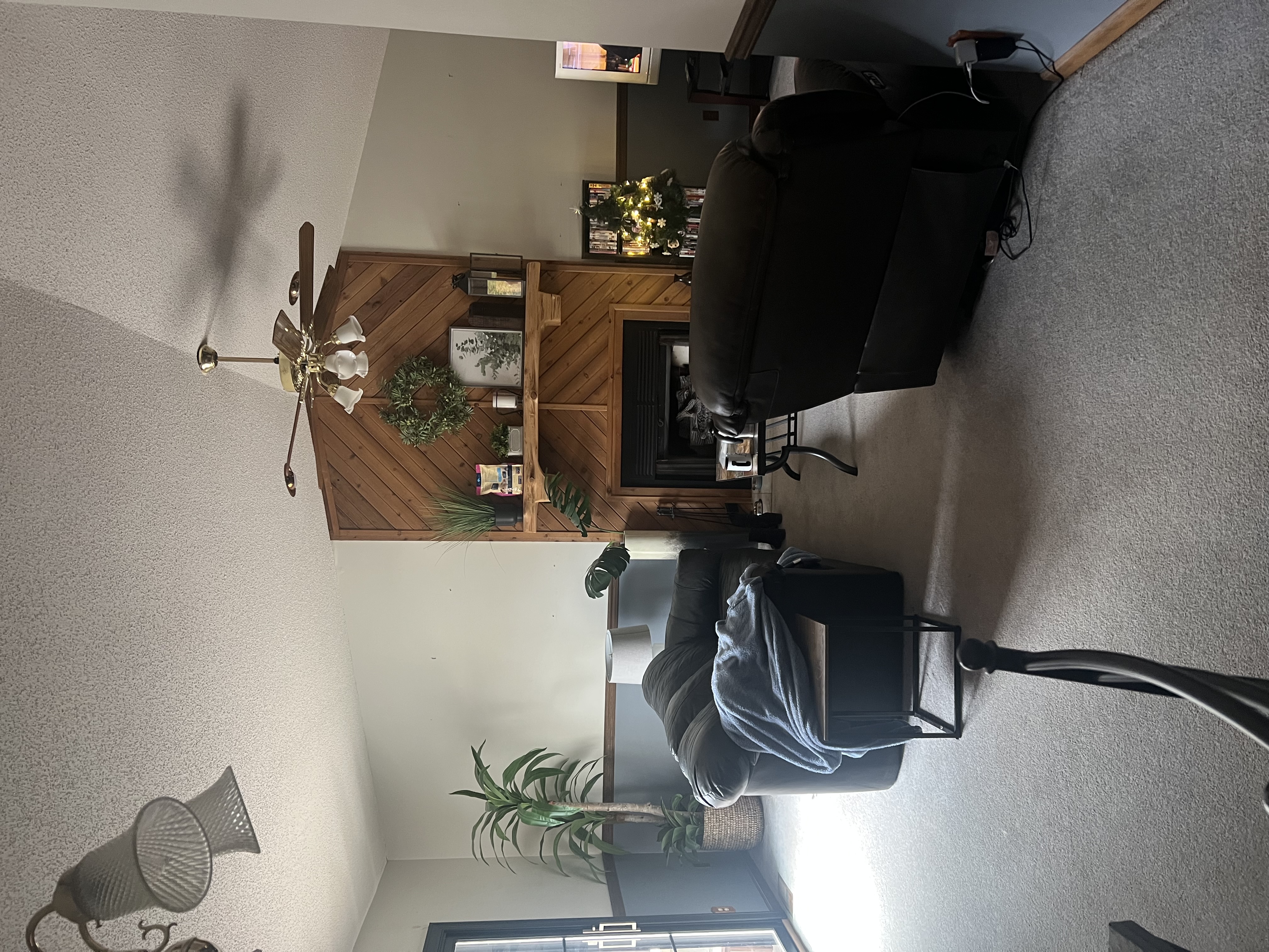 modernist interior shot interior of a cozy living room featuring a vaulted ceiling with a warm and inviting atmosphere the walls are painted in a soft gray color contrasting beautifully with the warm wooden paneling around the fireplace the ceiling fan is a vintage brass with wooden blades and soft white light fixtures in the room there are two comfortable couches in a deep rich black leather along with a matching recliner a large leafy green plant in a woven basket decorates the left corner adding a touch of nature a throw blanket in a calming blue is draped over the couch on the mantel greenery adorns the space creating a fresh lively touch subtle warm lighting from the standing lamp and nearby tree lights enhances the soothing atmosphere overall the room is a tranquil retreat perfectly blending natural elements with cozy comfort architecture