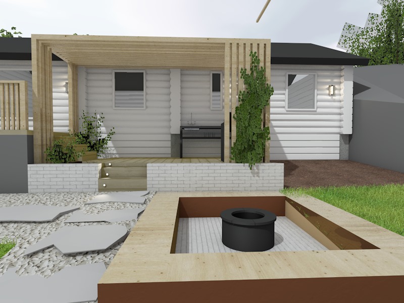 generate a realistic image of a modern house exterior with a minimalist design the house features sleek white walls with black window frames and trims in the foreground a bright blue sky and radiant sun creating a warm and inviting atmosphere the gray stone pathway leads to the entrance flanked by well manicured green grass on both sides modern outdoor stairs in dark gray lead up to the house with subtle garden lights enhancing the welcoming ambiance include contemporary outdoor furniture on a wooden deck in the background to complete the serene setting