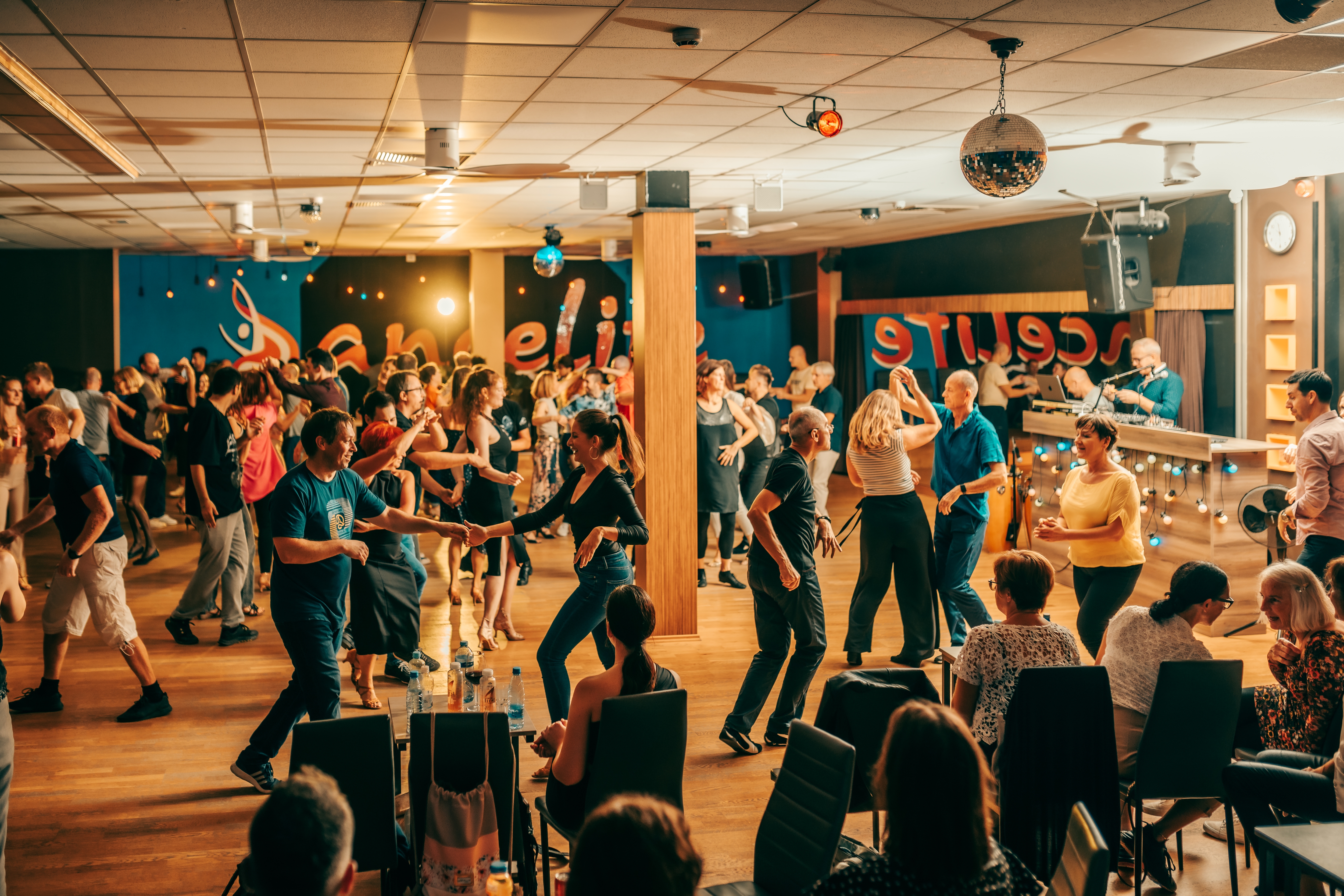 render a banner 16 9 ratio sensual dance couples romantic night romantic dark dancefloor with colourful lightshow contemporary dressed people