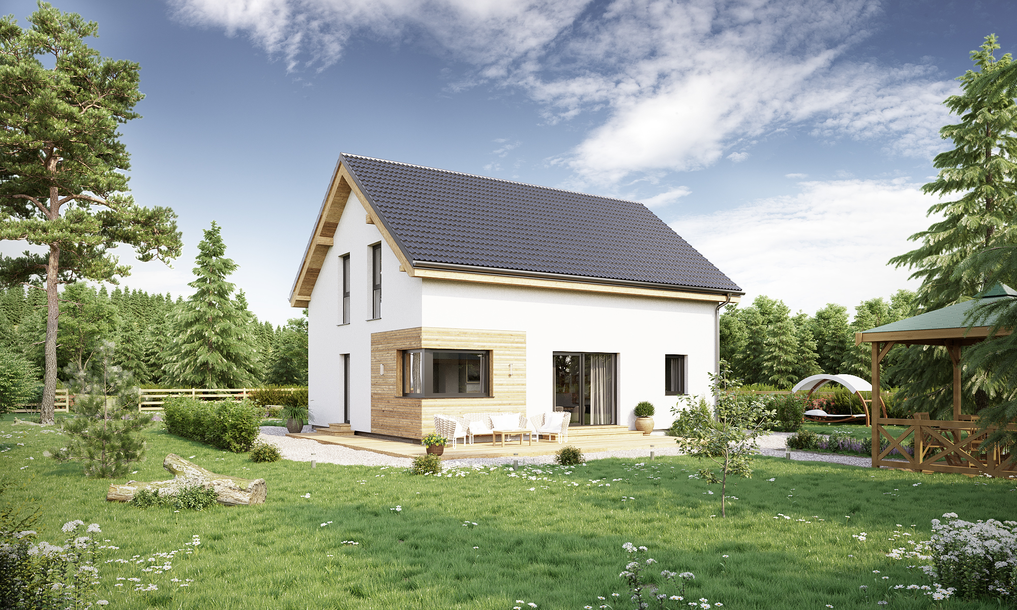 dieses haus soll statt einem satteldach ein walmdach bekommen bitte erstelle mir ein bild bei dem dieses haus mit 2 vollen gescho en und walmdach dargestellt ist das hei t das walmdach muss h her sitzen als das jetzige satteldach f ge terrassenseitig bitte noch 2 doppelfenster im obergescho ein