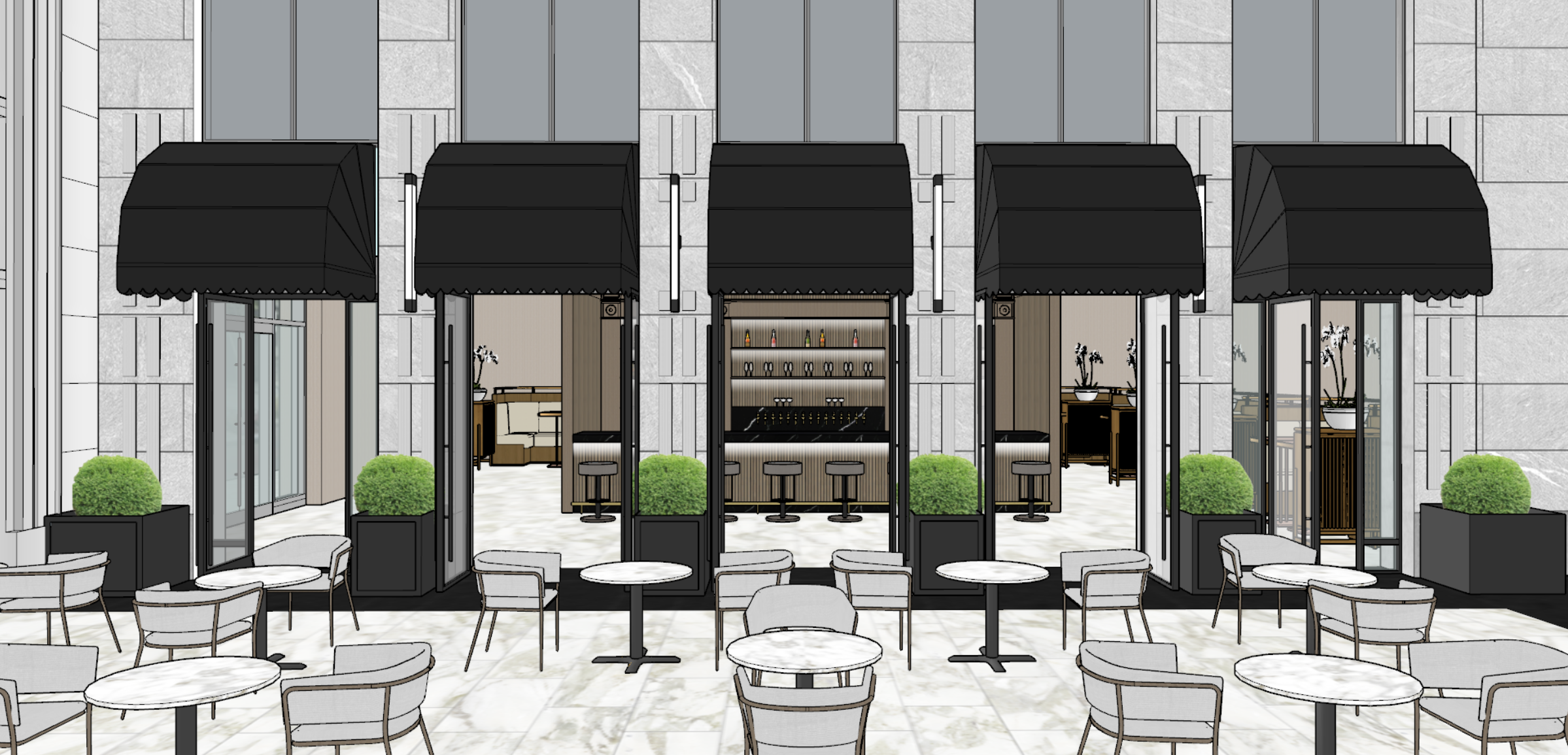 render lobby and bistro middle of the day illuminate all spaces to 4000k make bistro bright and light