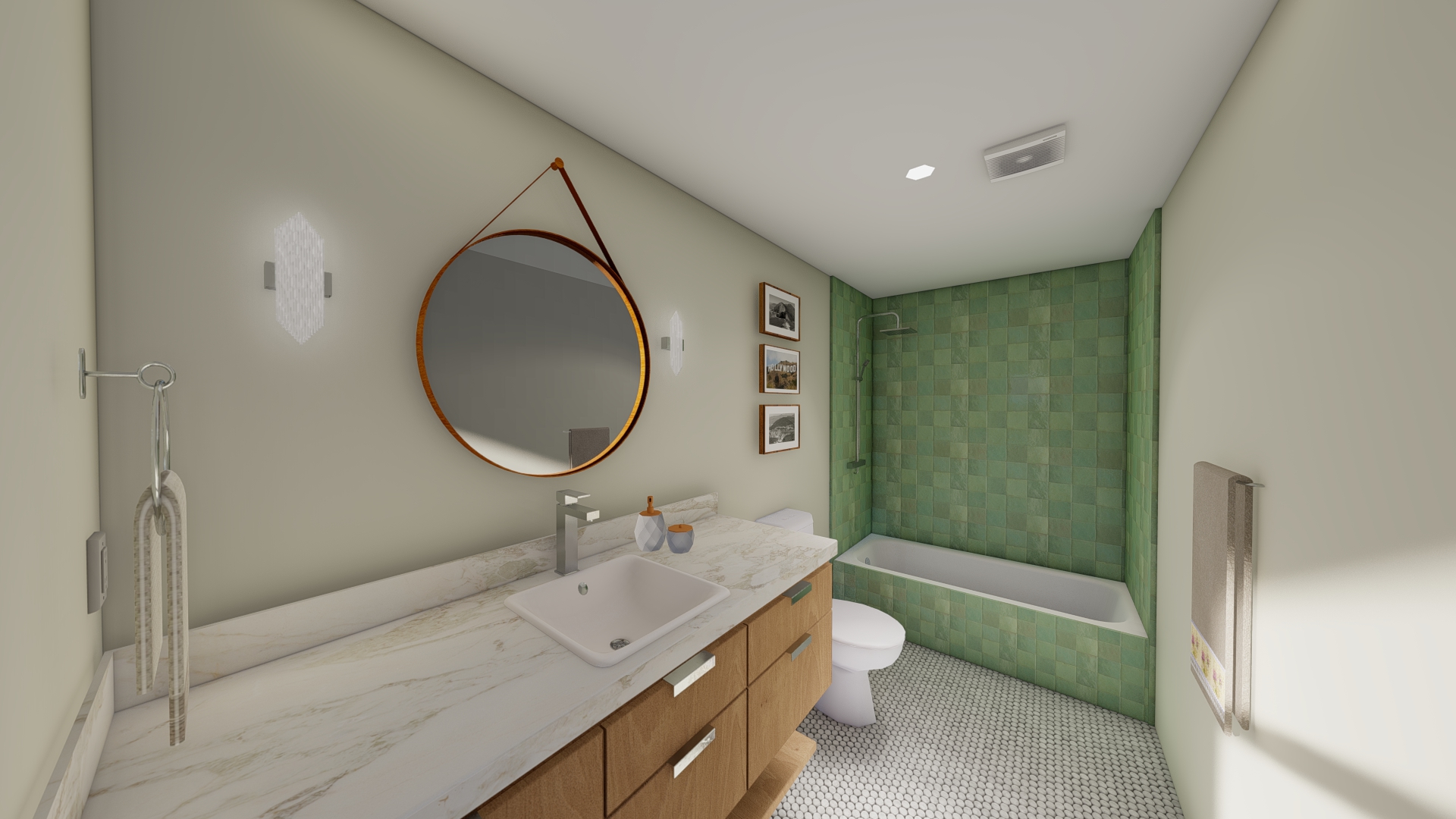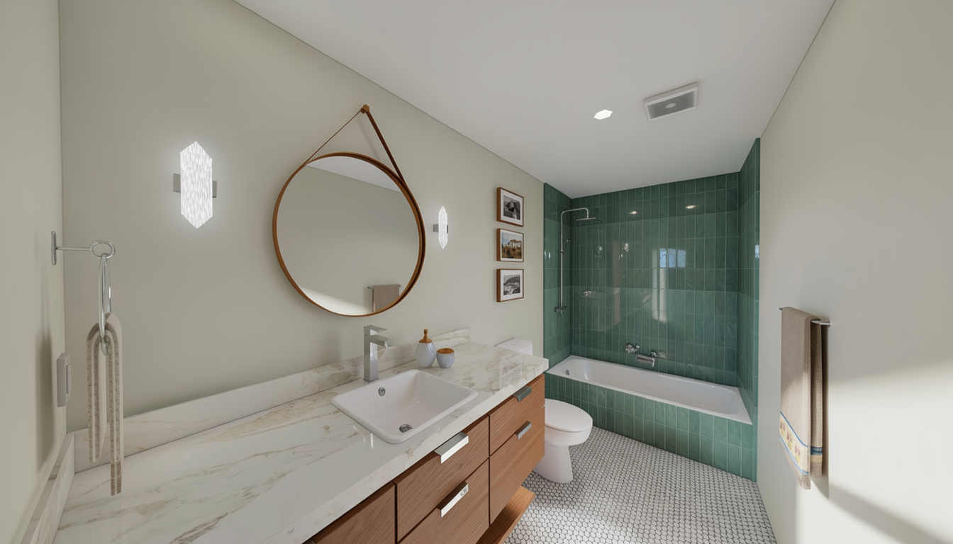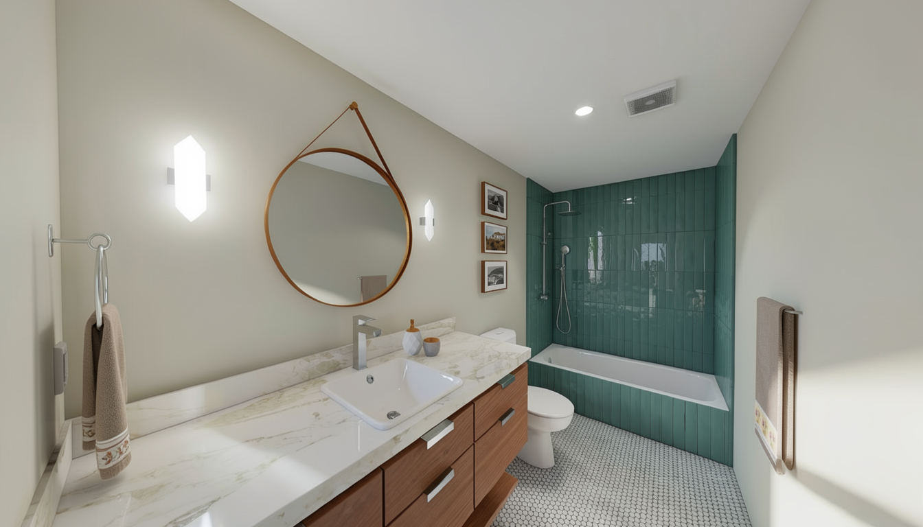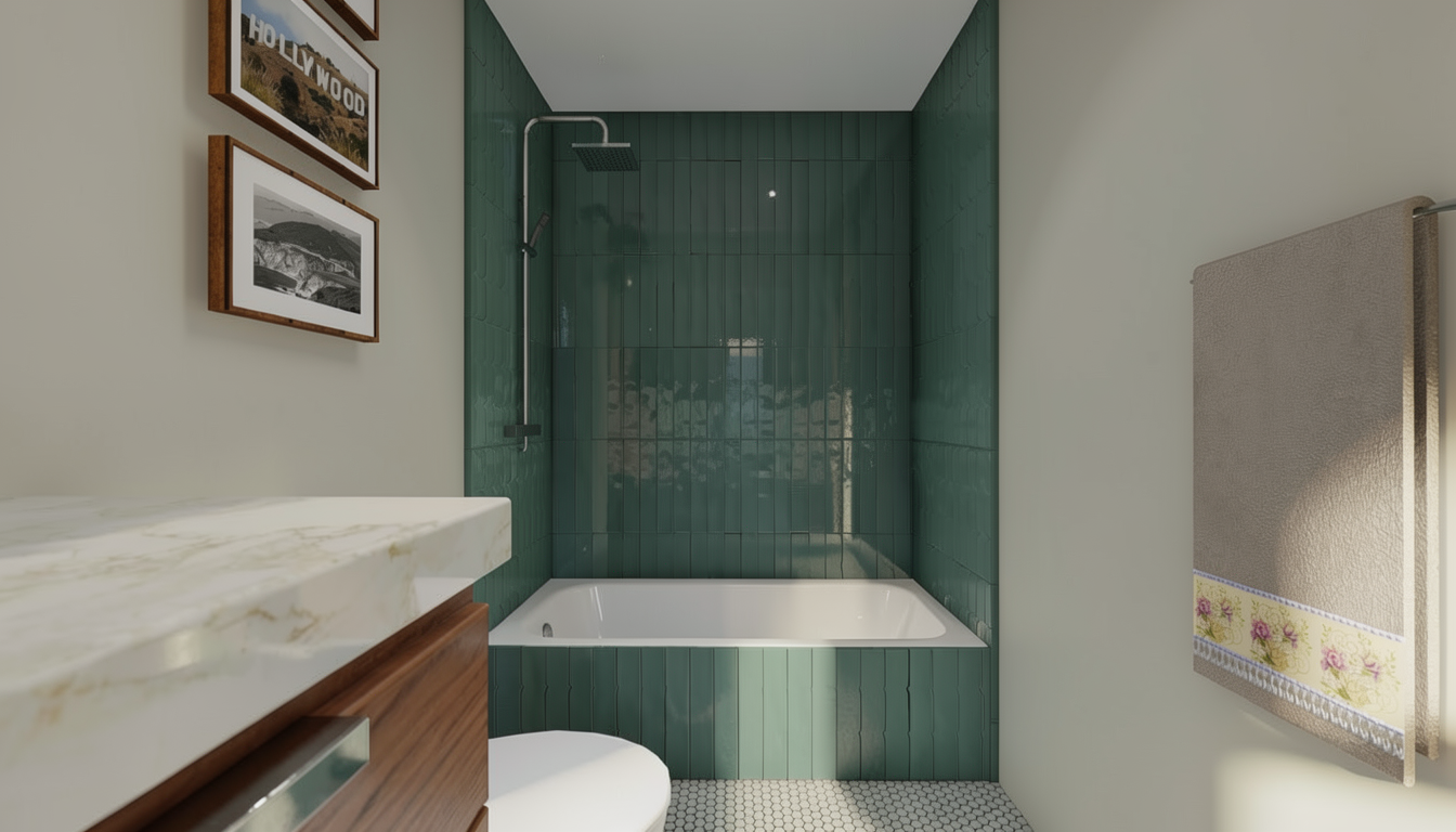 reconstruct this bathroom scene with full photorealism lock layout camera angle and object placement apply accurate material definitions glossy teal ceramic tiles with visible grout white acrylic bathtub chrome fixtures light mosaic floor tiles warm wood vanity marble countertop framed wall photos and a beige cotton towel with decorative border enhance the towel with natural folds realistic thickness woven texture and believable draping use soft natural lighting from the left realistic reflections global illumination and high resolution textures maintain true color fidelity and natural shadows no stylistic changes