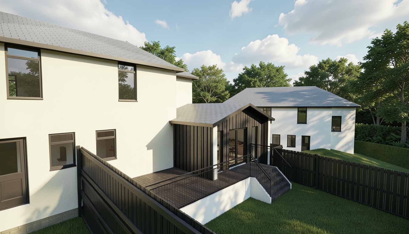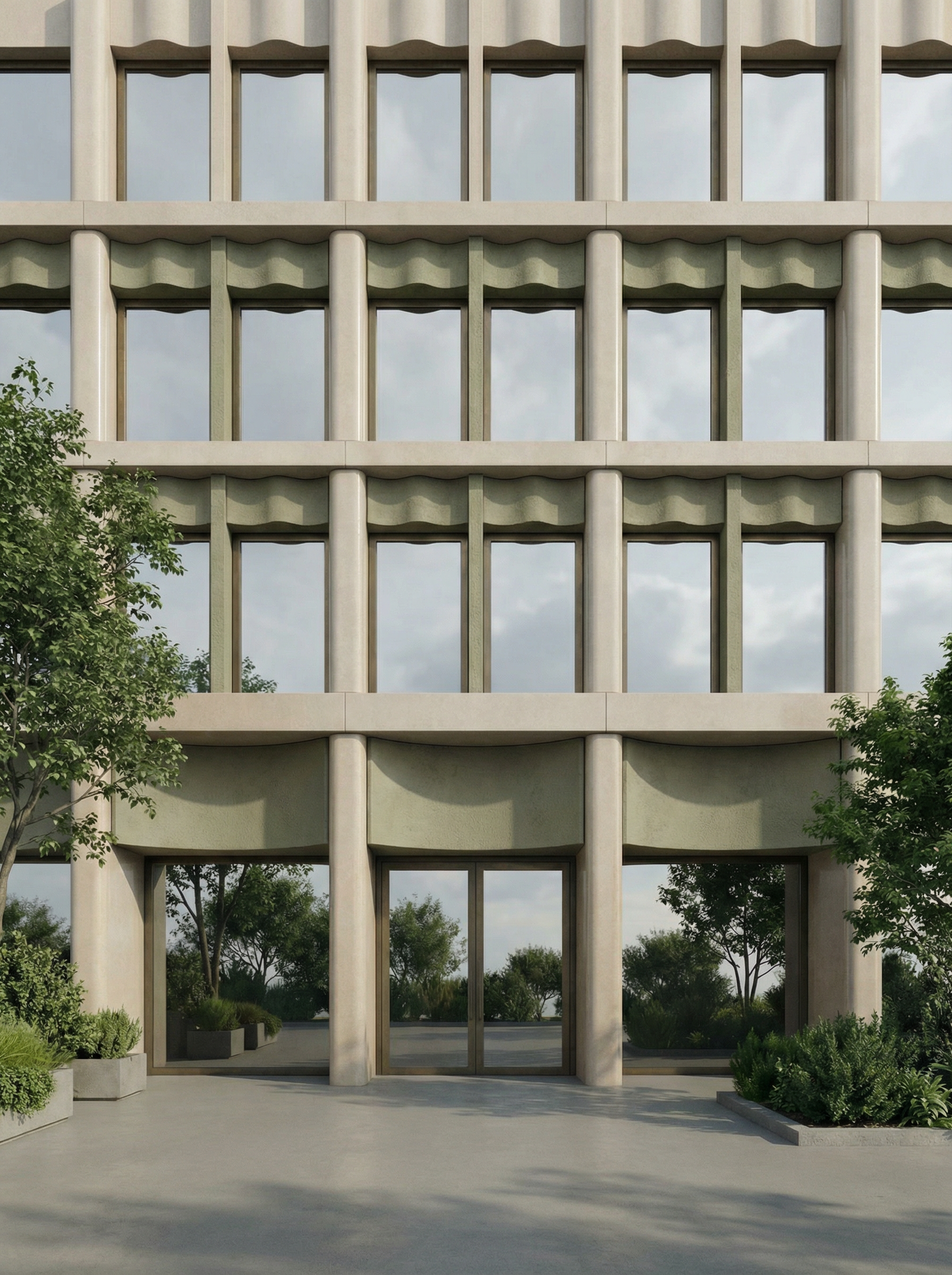 keep the exact same geometry scene content object positions materials textures and camera framing as the original render apply only atmosphere lighting mood and color grading set the scene at golden light sky with thin soft clouds and a cool to warm gradient steel blue overhead transitioning to warm tones near the horizon use cinematic soft lighting with moderate contrast gentle shadows cool ambient fill and warm interior window glow inviting realistic wet ground with realistic reflections on asphalt paving subtle specular highlights very subtle bloom around light sources crisp but natural detail plus a very light atmospheric haze for depth color grade cool shadows cool midtones warm highlights teal in shadows and midtones warm highlights controlled saturation clean neutrals no oversaturation photorealistic architectural marketing render look balanced exposure slightly cool white balance remove the fog make it brighter and softer keep the original bike lane remove the people keep the original text on the building remove the car desaturate it by 30