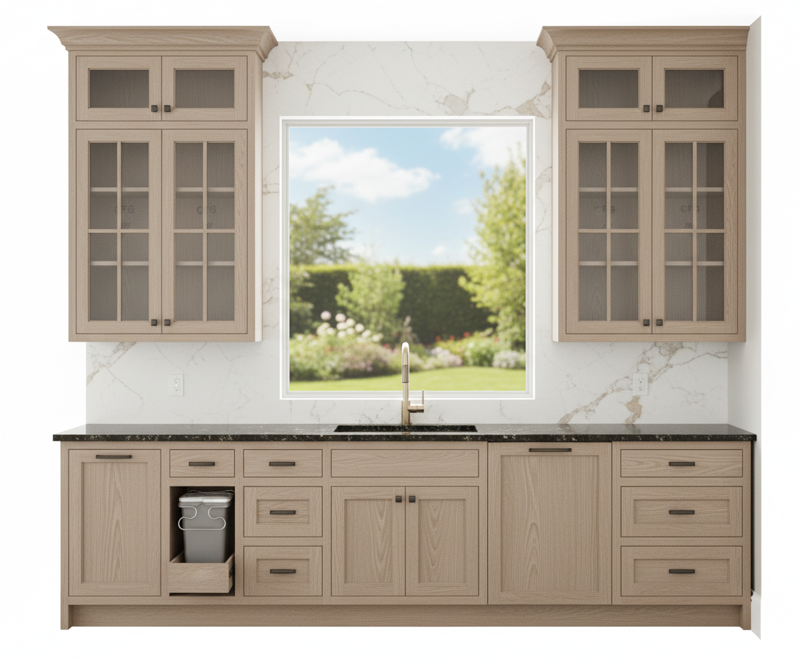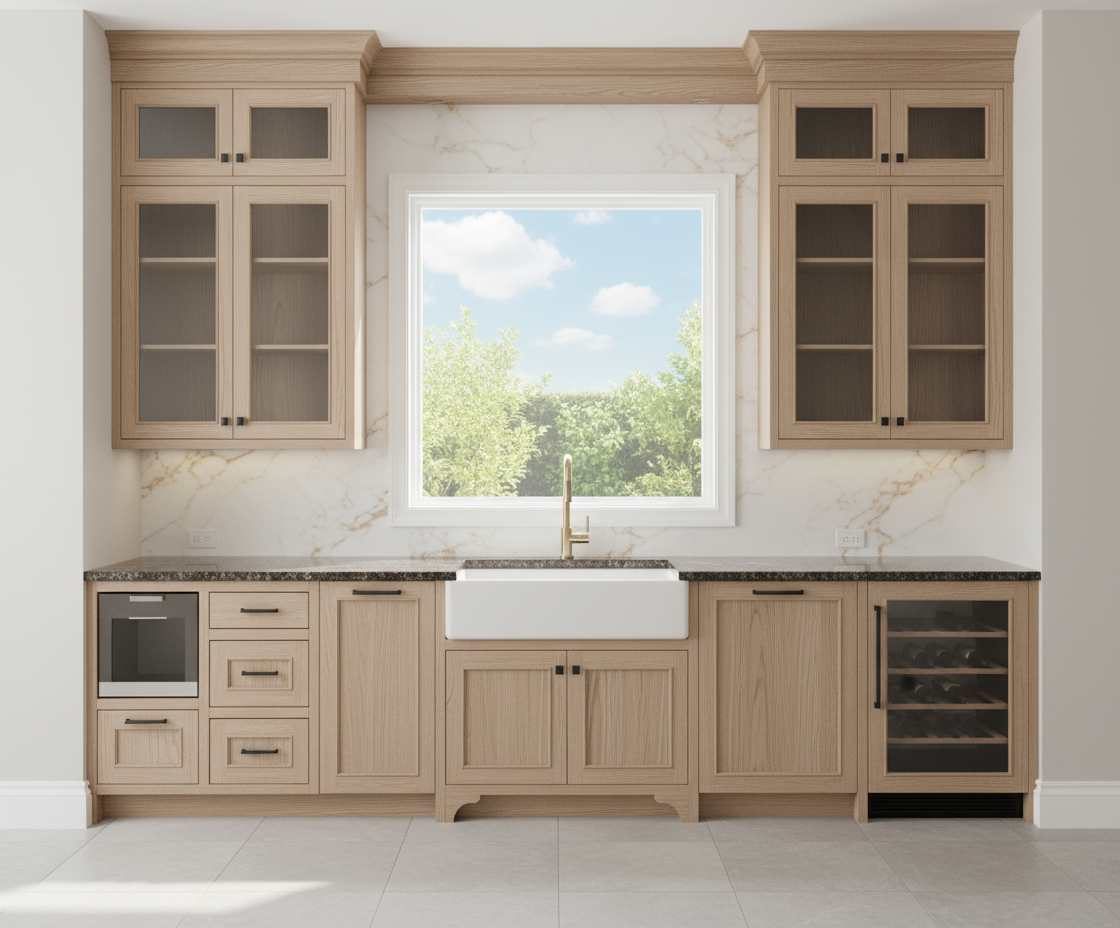 kitchen elevation sink window wall overall dimensions total wall width 132 11 center window opening approx 56 wide to be verified on site cabinet widths left right of window 38 each countertop height 36 upper cabinet height to crown molding verify ceiling height symmetry left and right sides mirror each other cabinetry door style as shown in reference image elite pinnacle elite finish same finish and crown molding detail as attached reference image glass cabinets extend from countertop up to crown molding glass door uppers with bi fold doors below symmetrical on both sides no open spacing all in closed cabinets base cabinets left side from window outward ice machine directly next to the sink on the left three drawer s stack drawer over door trash pull out furthest to the left base cabinets right side from window outward wine fridge directly next sink on the right three drawers stack drawer over door trash pull out if shown in original image countertop material absolute black leather granite edge profile match existing kitchen detail sink centered below window faucet shown centered on sink in elevation backsplash material calacatta castana quartz coverage from countertop up to underside of crown molding behind and between cabinets note behind glass uppers remains quartz surface visible through glass appliances fixtures sink centered on window faucet as shown in reference image ice machine left base cabinet wine fridge right base cabinet trash cabinet pull out as per image hardware to match reference cabinetry image style finish as provided notes all measurements to be field verified elevation to be rendered with realistic finishes granite quartz cabinet finish glass reflection ensure symmetry on both sides of window glass cabinetry should read fully transparent with visible quartz backsplash behind include crown molding detail at top of cabinets appliances shown true to scale faucet centered in window view