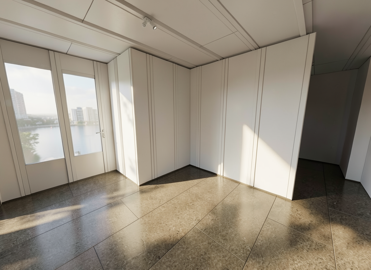 keep the same exact view do not alter keep the same geometry keep the same lines render this photo to make it look realistic make all the wood a much lighter tone make the wood lighter make the wood lighter remove the wood panel lines from the wall make it flat wood make the wood less yellow undertoned make it a light bright wood tone make the wood so light its almost white make the window trim a warm bronze finish