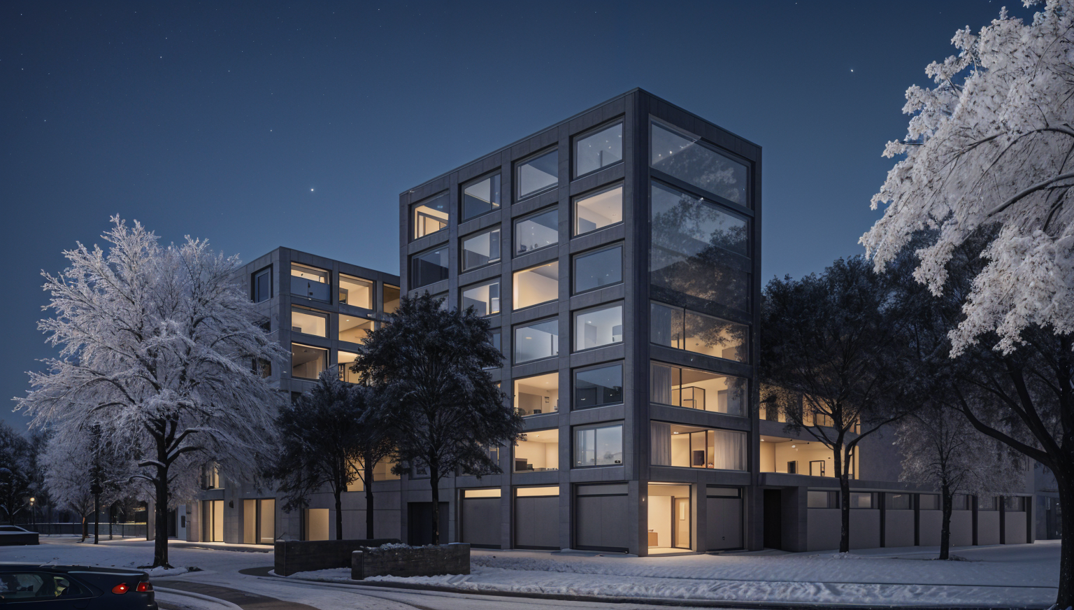 night exterior flat house winter riverside architecture