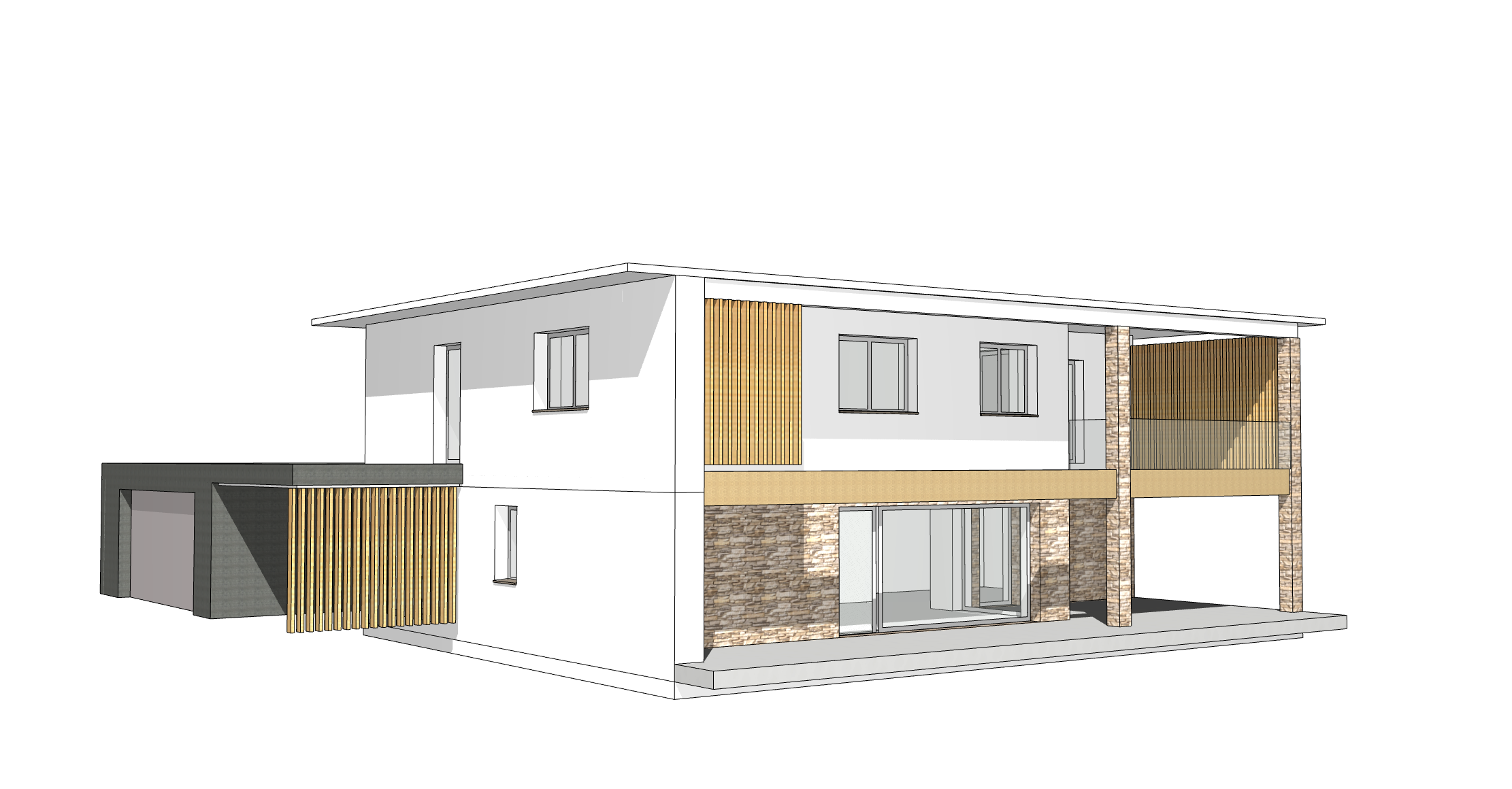 modernist exterior shot modernist exterior shot ultra modern two story residential villa in bauhaus style clean geometric lines fa ade in light beige smooth plaster finish upper floor features vertical warm oak wood slats with structural wooden beams and slats as a screen and seamless glass railings on a spacious balcony just in the right section of the first floor ground floor features a recessed wall made of high quality light beige natural stone masonry accentuated by soft warm architectural spotlights in the background a garage made of bush hammered concrete gestockter beton groundfloor deck made of porcelain stoneware large environment driveway made of grey granite cobblestones lush manicured green lawn with minimalist landscaping background majestic montafon alps under a soft twilight sky atmosphere early spring blue hour peaceful and cinematic lighting high end architectural photography 8k resolution photorealistic architecture architecture