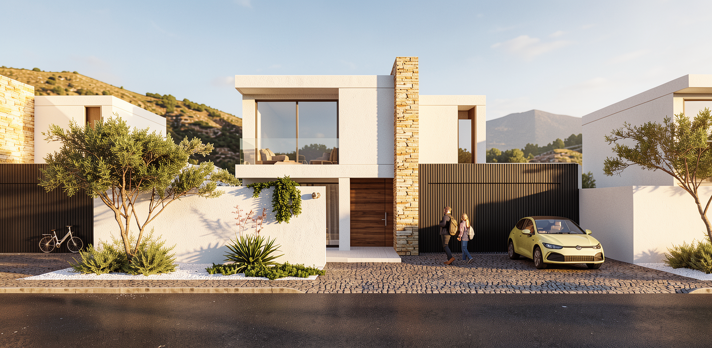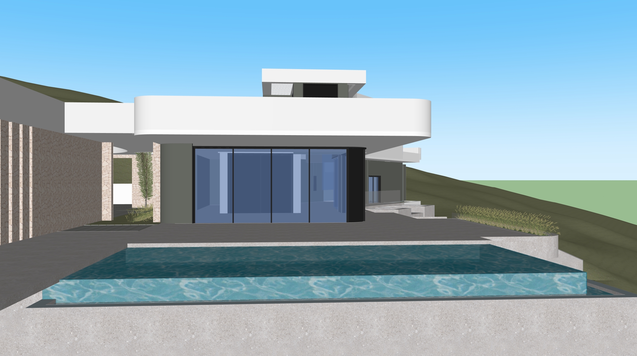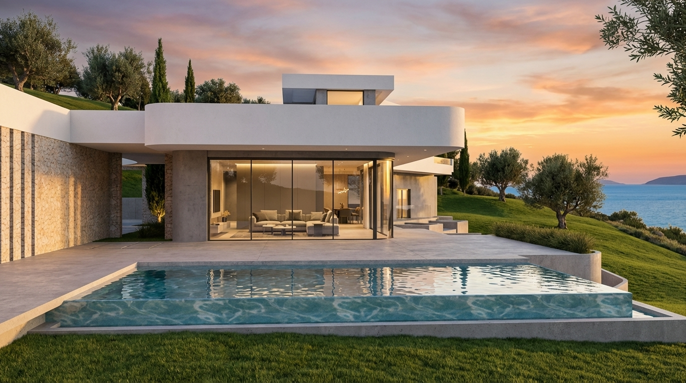 modern luxury hillside villa in tolo greece viewed from a lower eye level angle showing the entrance terraces and pool with the sea visible in the background the terrain is a smooth natural slope fully covered with green grass the landscape is continuous and natural without stepped terrain without terraces and without stone or gravel surfaces pool the swimming pool is fully embedded into the ground and integrated into the terrain no visible structural walls no exposed concrete base no infinity edge the terrain and grass continue naturally around and below the pool completely covering its base water is ultra realistic with reflections transparency soft ripples and natural light interaction architecture contemporary minimalist villa with curved and cantilevered slabs large glass fa ades warm interior lighting is on fully furnished interior visible through glass living room sofas dining table modern furniture grey wall paint like the original material in the model landscape natural green lawn dominates the site a few mediterranean trees such as olive trees and cypress trees placed organically no gravel no rocks no dry landscape around the pool put a concrete floor circulation minimal architectural steps only near the entrance clean and simple not forming terraces and not dominating the landscape view open sea view of tolo with calm blue water and horizon line visible lighting atmosphere golden hour sunset warm luxurious lighting cinematic sky soft shadows high end luxury villa atmosphere elegant and calm materials exposed concrete white plaster natural stone only on the building large glass panels style photorealistic ultra detailed architectural visualization real estate quality render global illumination