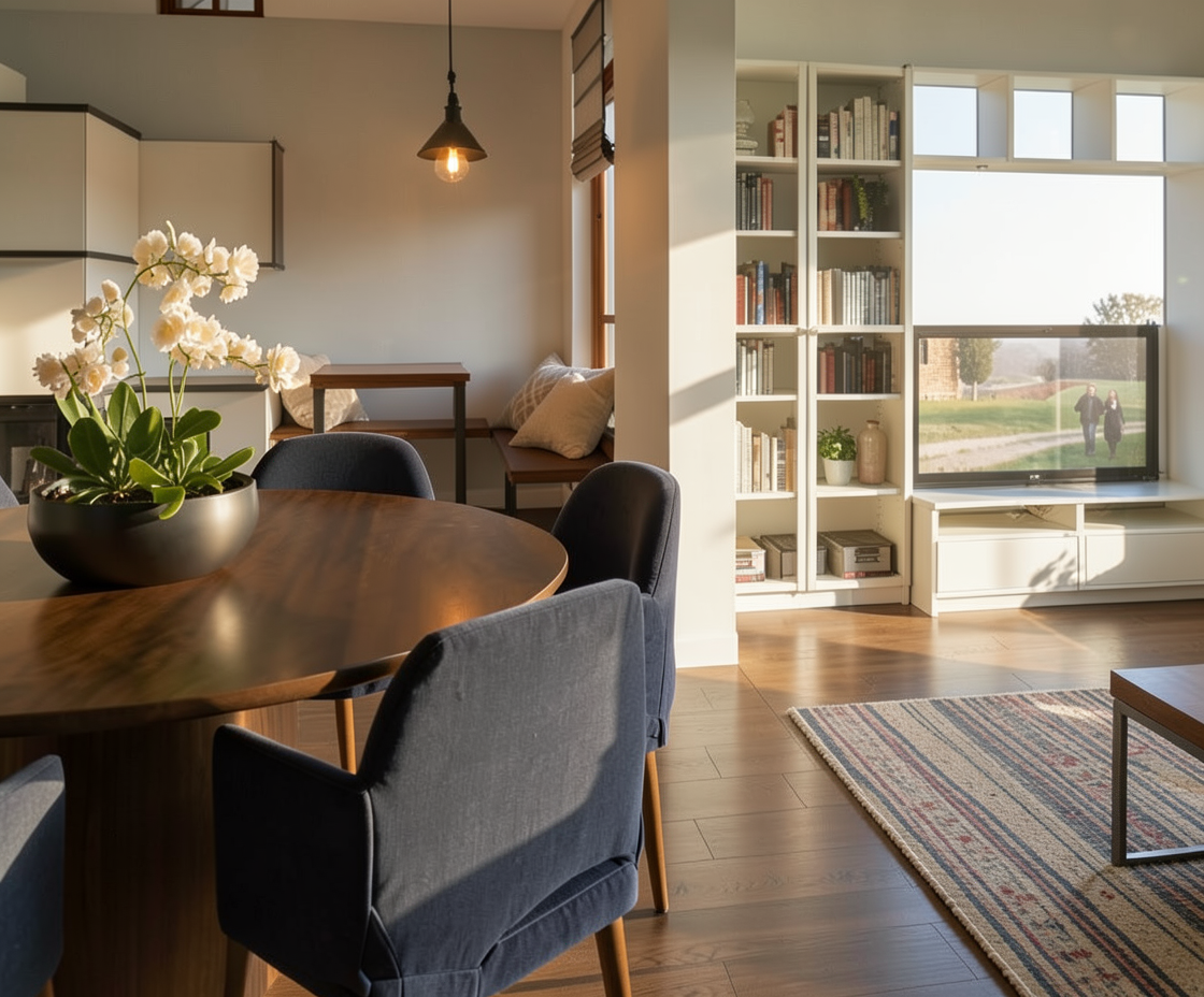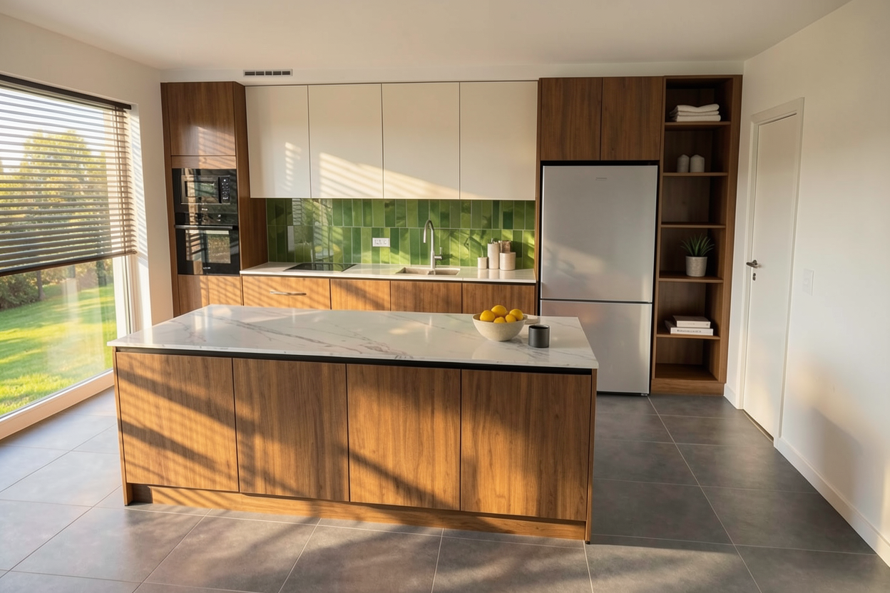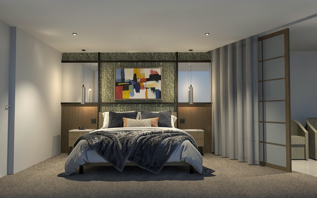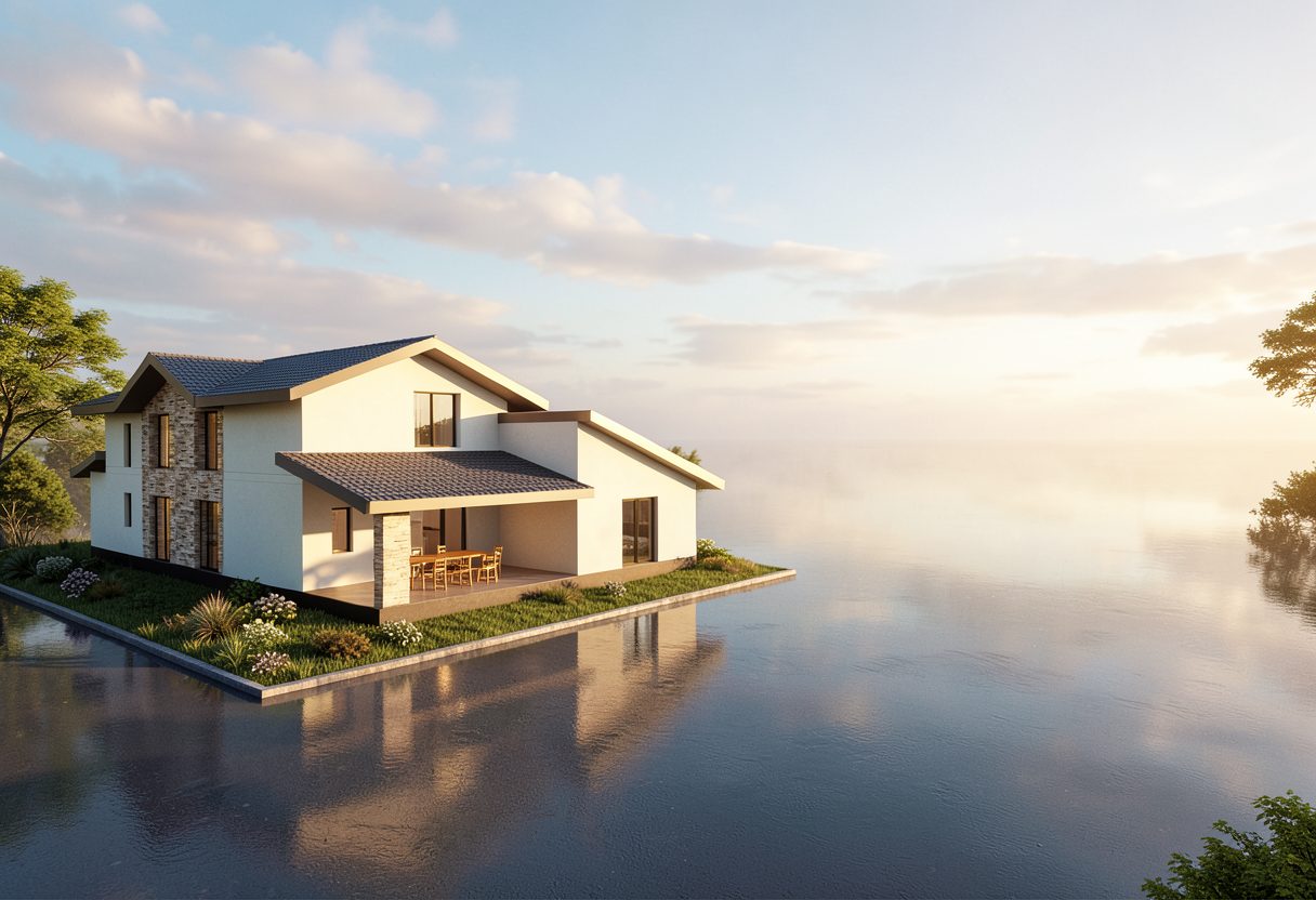 modern luxury hillside villa in tolo greece viewed from a lower eye level angle showing the entrance terraces and pool with the sea visible in the background the terrain is a smooth natural slope fully covered with green grass the landscape is continuous and natural without stepped terrain without terraces and without stone or gravel surfaces pool the swimming pool is fully embedded into the ground and integrated into the terrain no visible structural walls no exposed concrete base no infinity edge the terrain and grass continue naturally around and below the pool completely covering its base water is ultra realistic with reflections transparency soft ripples and natural light interaction architecture contemporary minimalist villa with curved and cantilevered slabs large glass fa ades warm interior lighting is on fully furnished interior visible through glass living room sofas dining table modern furniture grey wall paint like the original material in the model landscape natural green lawn dominates the site a few mediterranean trees such as olive trees and cypress trees placed organically no gravel no rocks no dry landscape around the pool put a concrete floor circulation minimal architectural steps only near the entrance clean and simple not forming terraces and not dominating the landscape view open sea view of tolo with calm blue water and horizon line visible lighting atmosphere golden hour sunset warm luxurious lighting cinematic sky soft shadows high end luxury villa atmosphere elegant and calm materials exposed concrete white plaster natural stone only on the building large glass panels style photorealistic ultra detailed architectural visualization real estate quality render global illumination