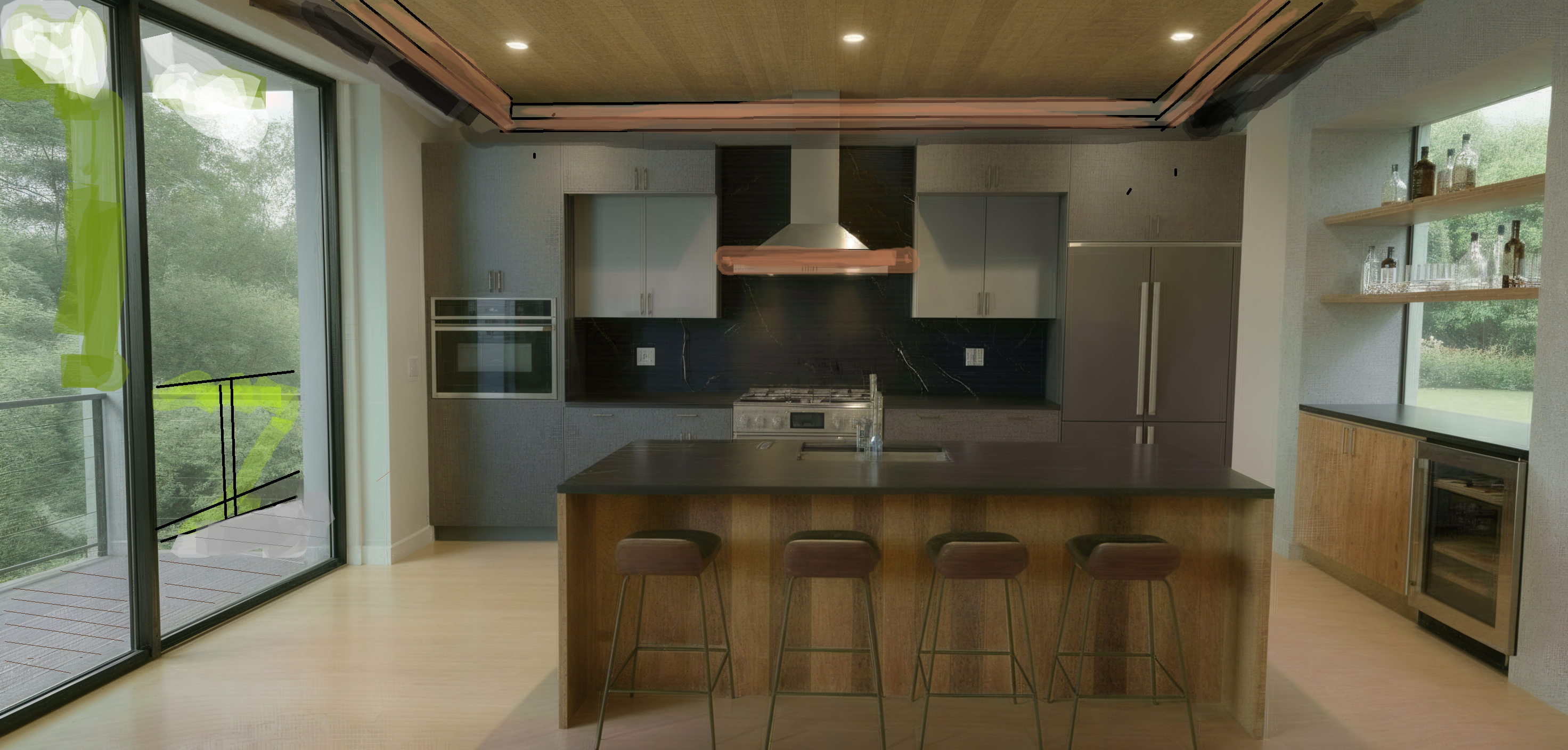 i want to convert this image to a mountain modern interior with a floating ceiling