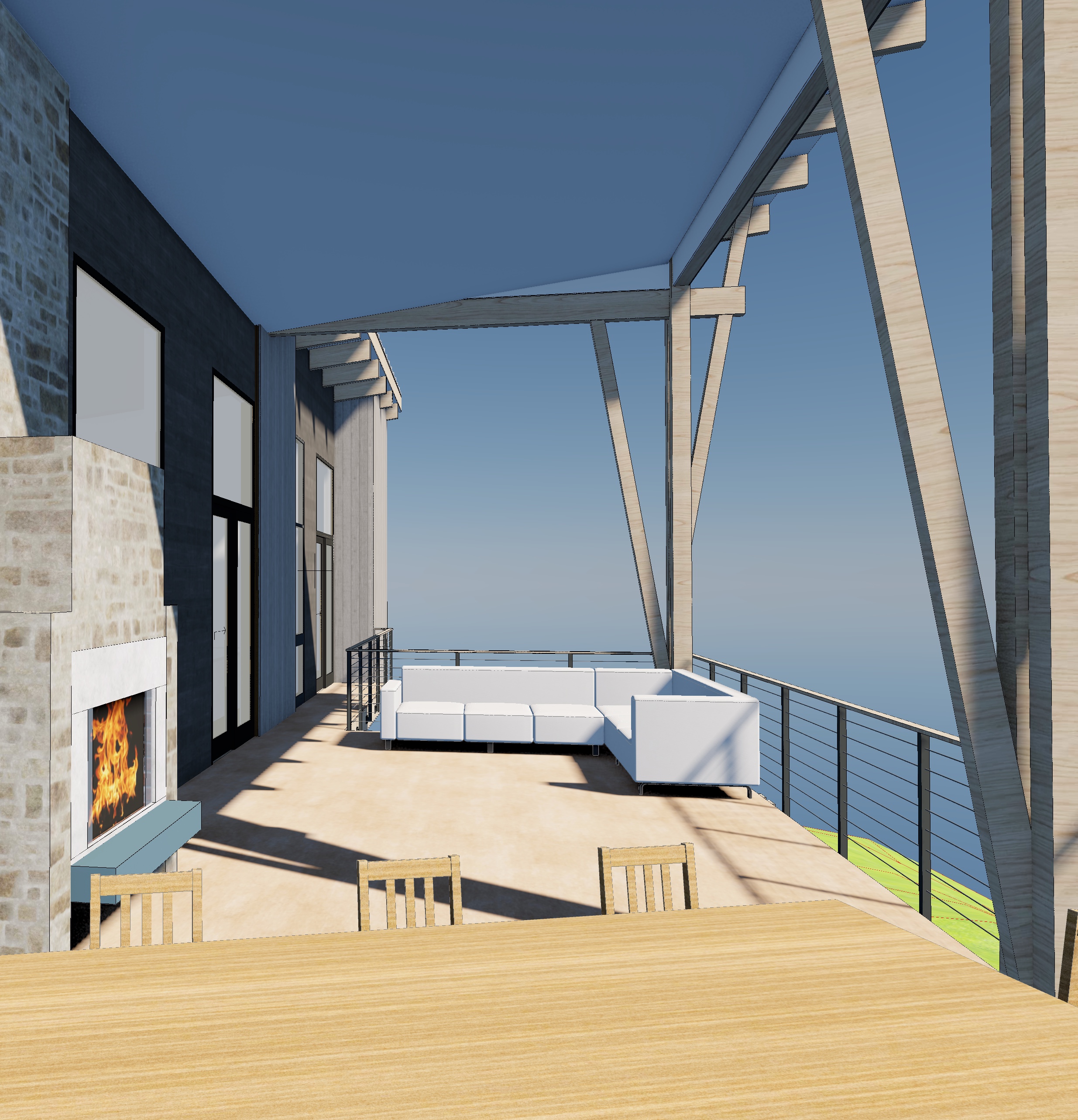 mountain modern ski home warm light emanating from the windows vertical siding in weathered wood brown areas and horizontal siding in black areas snowy pine forest around the home and distant low mountains alpine glow from behind the camera party on the deck