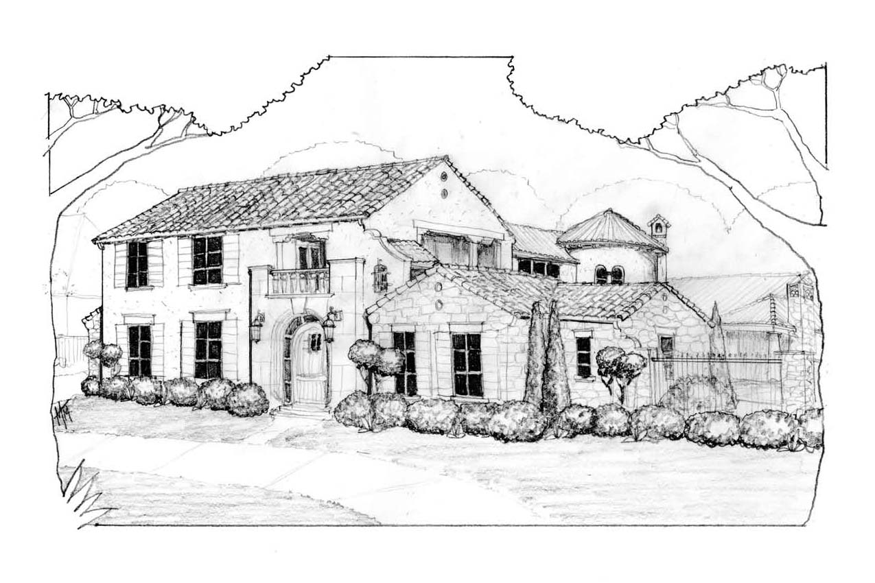 stucco and stone tuscan house with clay tile roof and courtyard