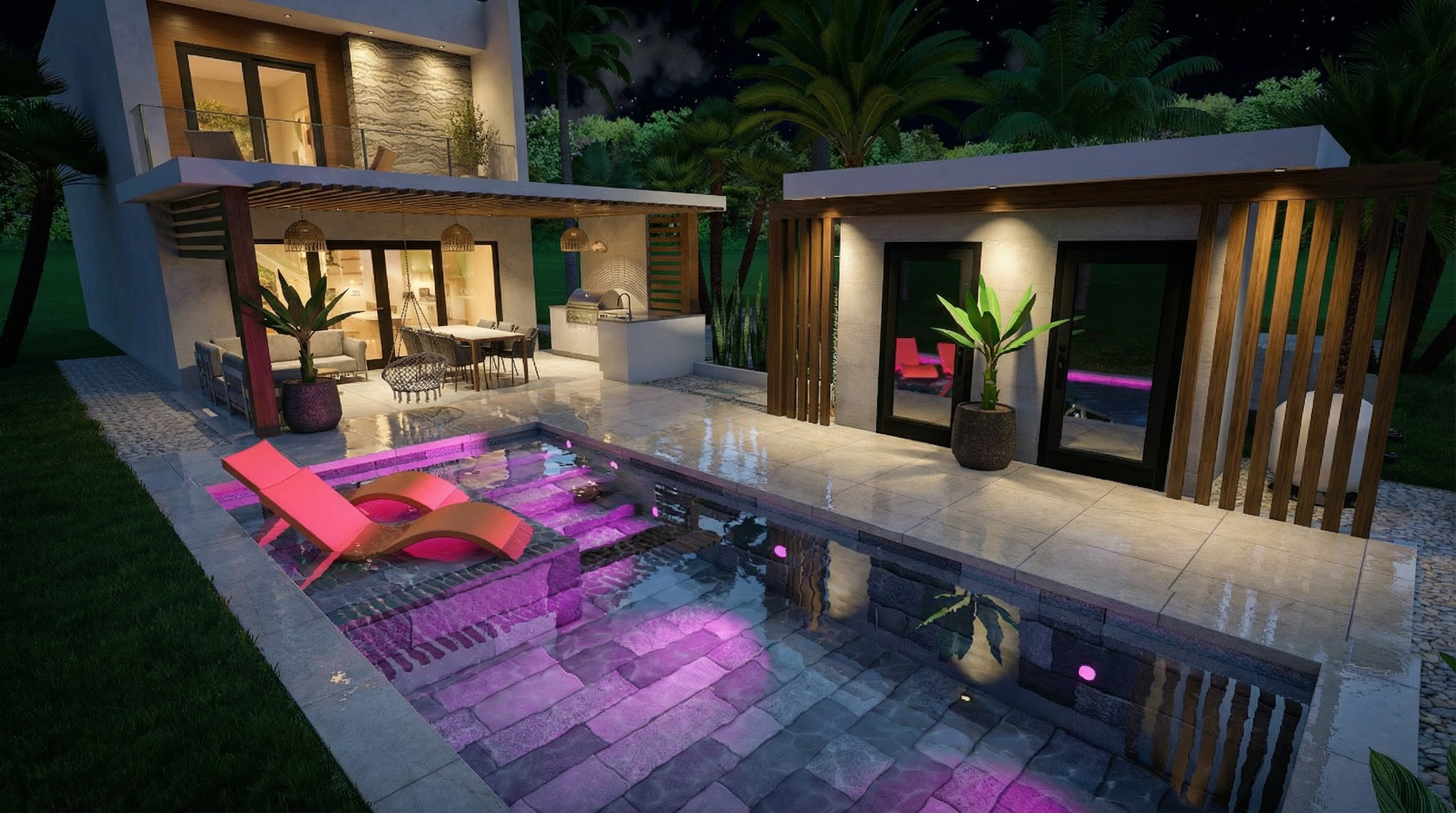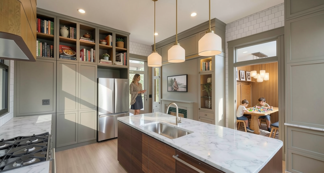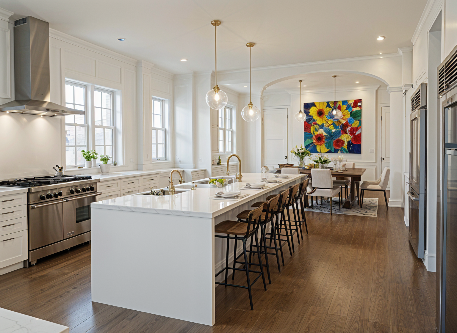 realistic image luxurious kitchen white painted panels on walls and columns add interior lighting add place settings at table and island add colorful painting on back wall of dining area add 2 small glass globe pendant lights over the island only remove sink next to island only remove outlet at end of island do not change anything except remove the 2nd sink at the island