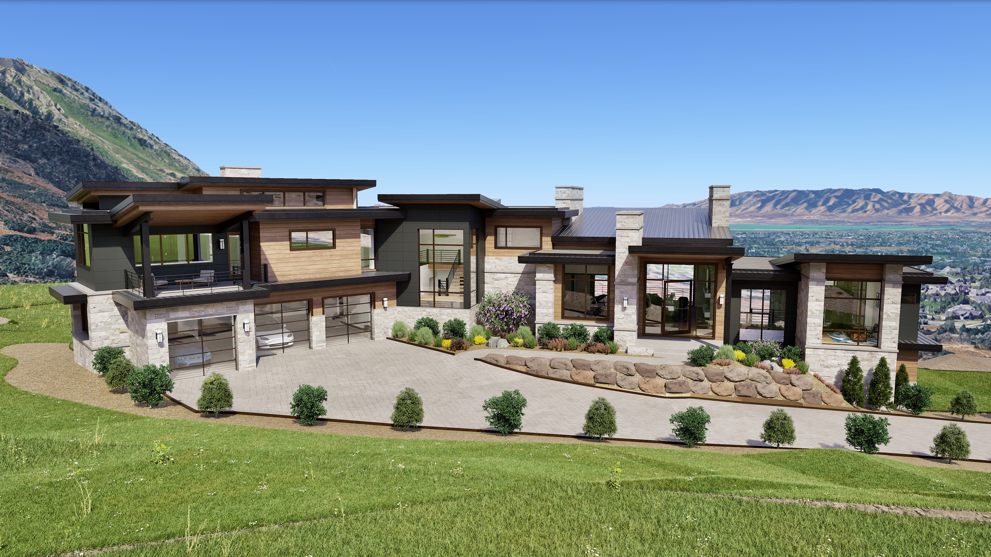 don t change the structure a modern home made from the following materials brown horizontal wood siding white dry stacked stone veneer aluminum acm metal paneling dark gray aluminum fascia and a dark gray blue metal roof enhance the detailing textures and shadows on the materials don t change the background but enhance the texture and vegetation change the foreground landscaping to include more grass and short shrubs enhance the landscaping around the house so the plants feel more realistic change the garage door to be glass with thick black mullions the light path from the sun will be luminating the front of the exterior