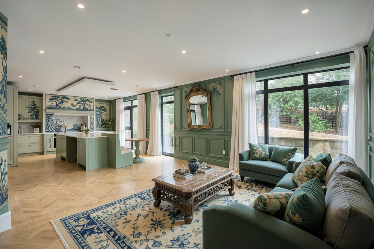 do not move any walls structural elements or window positions maintain all existing furniture keep windows per the current position high end living room make it modern use some green and blue chinoiserie theme not too heavy white linen curtains and add panelling to the walls add a big mirror on the wall between the 2 windows furnish keep modern keep walls the existing colour