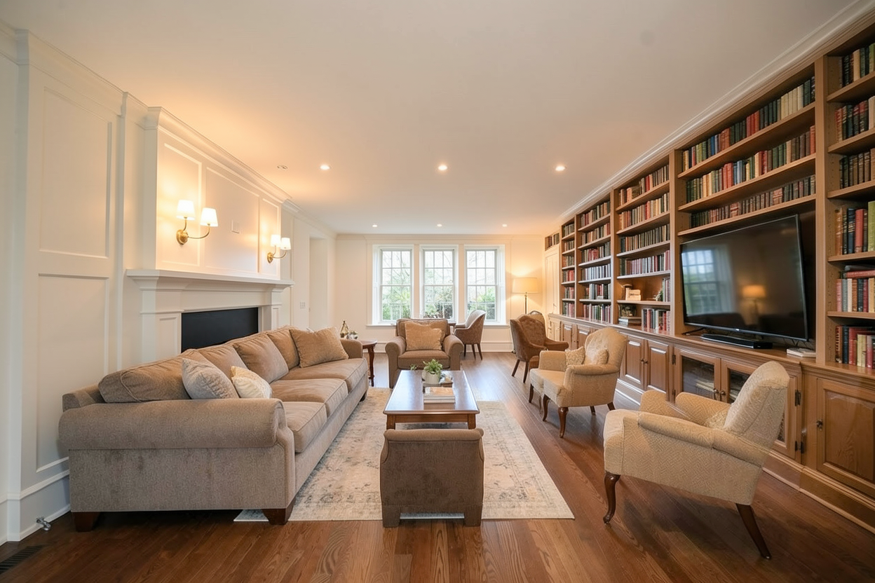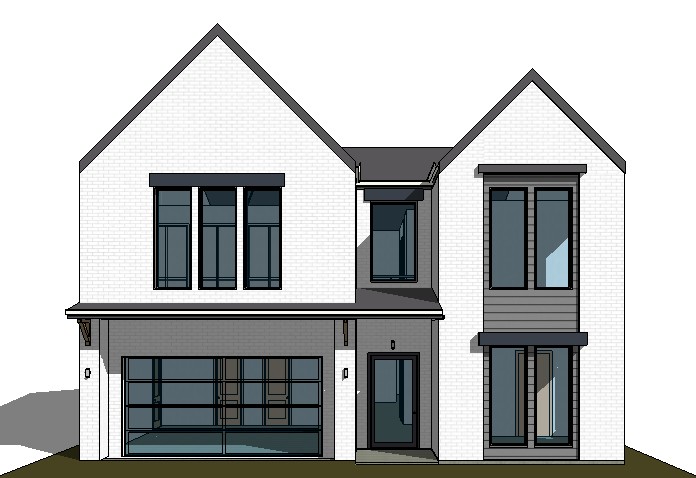 white brick dark grey siding trees in background 4k render cloudy day dark grey garage door grills in windows