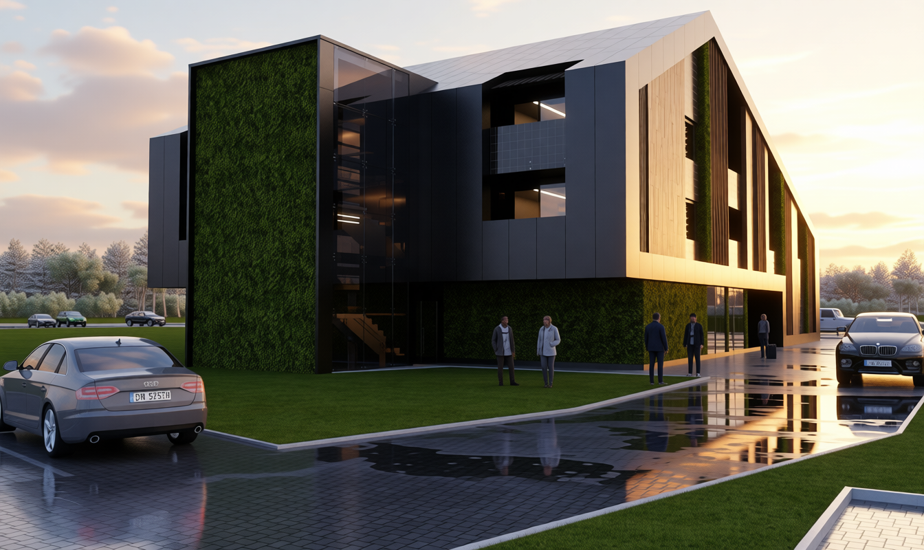this house has a glass pivot front door the double section garage door is black in colour the is charcoal colorbond roof sheeting the front facade is plastered please add grass infront of the house with a big tree on the right hand side of the paved driveway remove the window on the right hand side bring the house in on the right hand side in line with the front right corner the house has a small porch area infront of the window move the tree closer to the middle of the grass remove the window on the right and align house with front corner