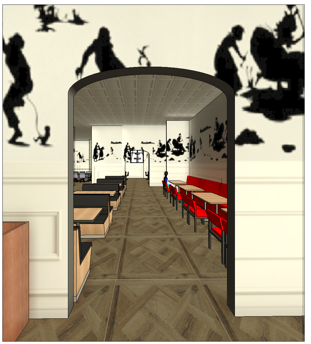 transform this rendering into a high precision realistic view into the restaurant the kara walker mural on every every wall of her silhouette artwork all upholstery and finishes should evoke a british pub style settings the walls should be peppered with large scale artwork on top of the kara walker mural