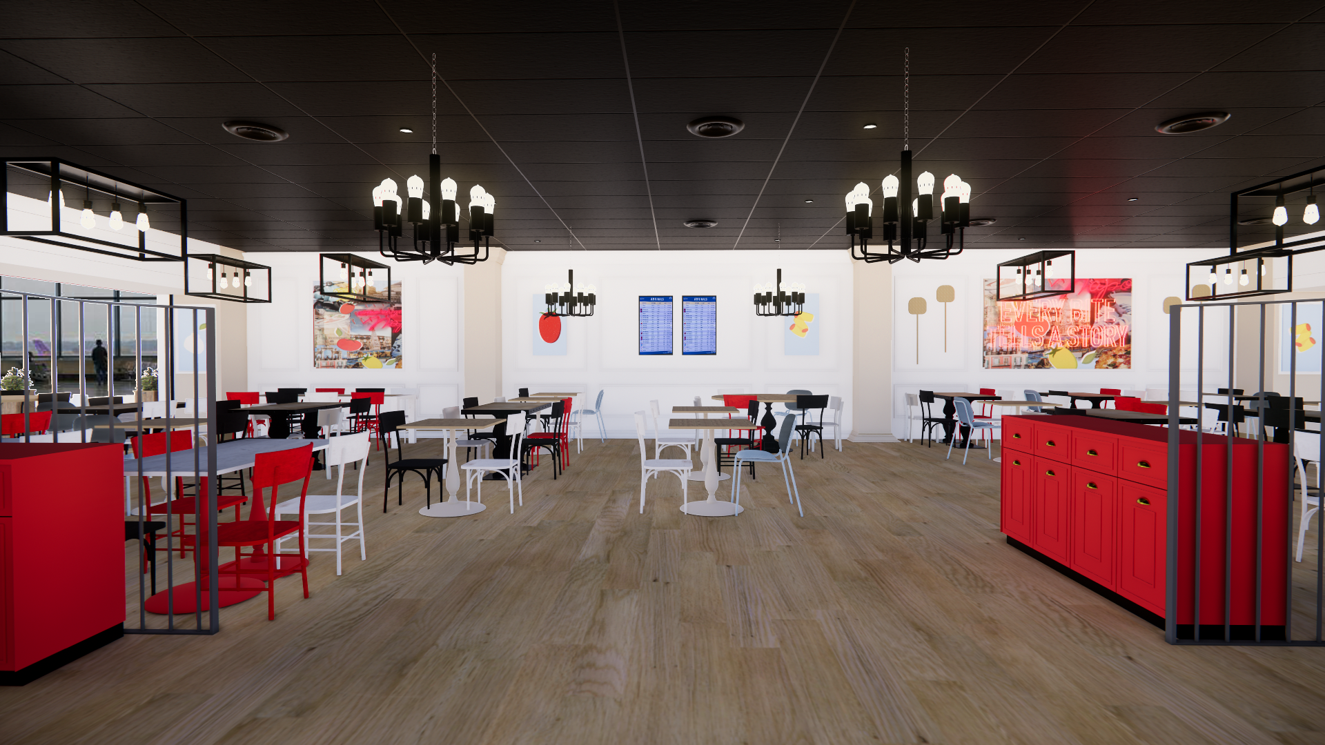 transform the provided restaurant interior image into a high end photorealistic render with neutral brightly lit space with warm highlights while keeping everything exactly the same same proportions same bar shape same seating same ceiling structure same wall finishes same spatial configuration do not change the furniture do not change the materials do not change the composition place diners eating pizza in the existing chairs and the existing tables do not move or alter any objects geometry textures colors or furniture positions the chairs throughout the restaurant must remain exactly in the same locations and proportions but their materials should read realistically the chairs geometry should not change they are painted wood in red white and black keep this material but shsow only a slight abount of wood grain underneath maintin the brightness of the neon sign on the back wall add premium table settings including wine glasses cutlery cloth napkins while keeping all tables and chairs in their exact positions include modern young guests seated at the tables enjoying pizza casually social correctly scaled tastefully integrated without crowding or obstructing architectural details add a waiter taking order from some of the diners hints of warm glow from the chandiliers soft shadows enhanced color richness and luxurious catalog level realism improve depth and realism through material textures while keeping the entire scene exactly as originally designed do not add any furniture or change the compoition or geometry add only the diners place settings the waiter and enhance the photo realism