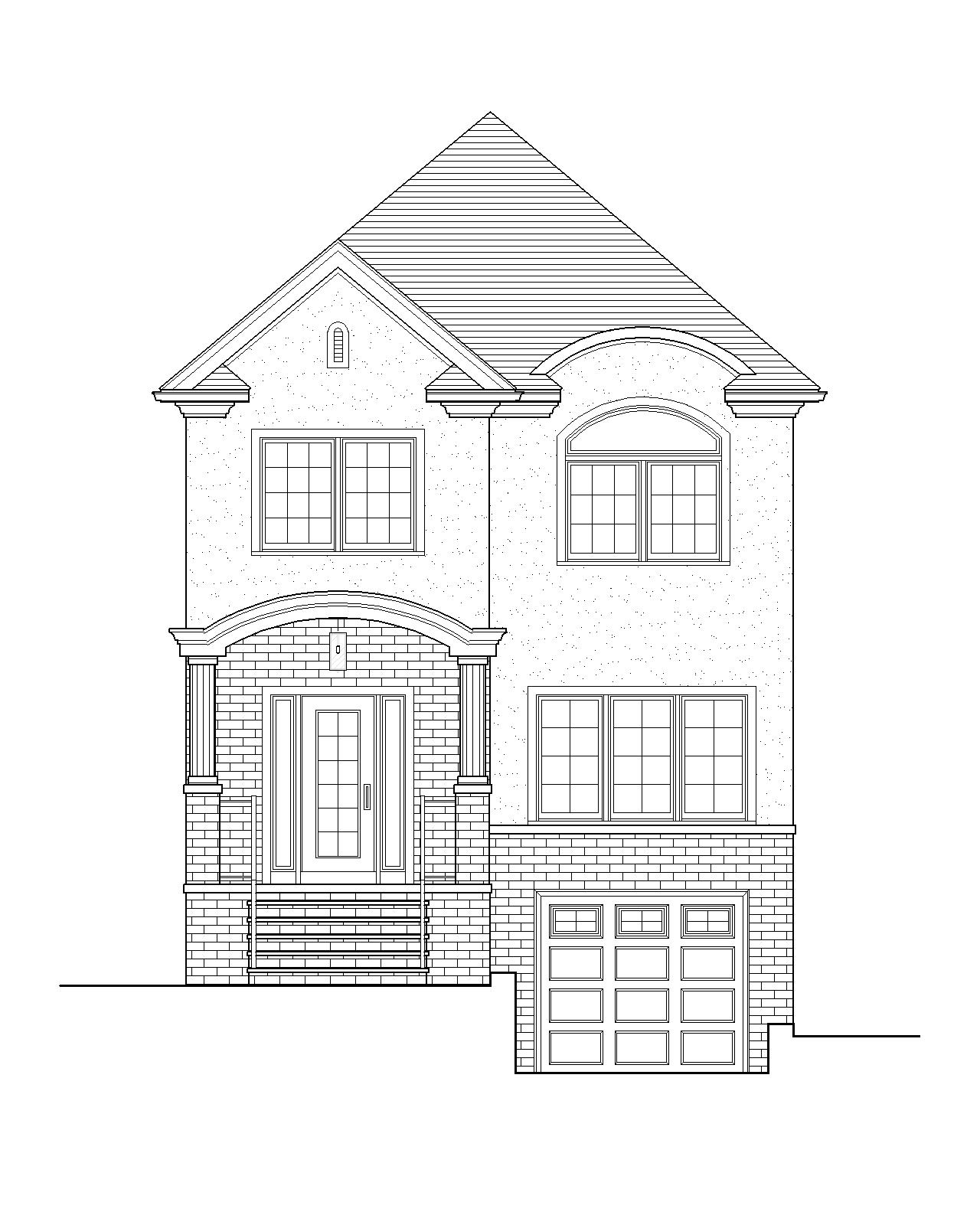 render this elevation realistic in a setting with some light landscaping in a residential neighborhood the windows and doors should be black the brick should be a natural color and stucco should be in a light modern color