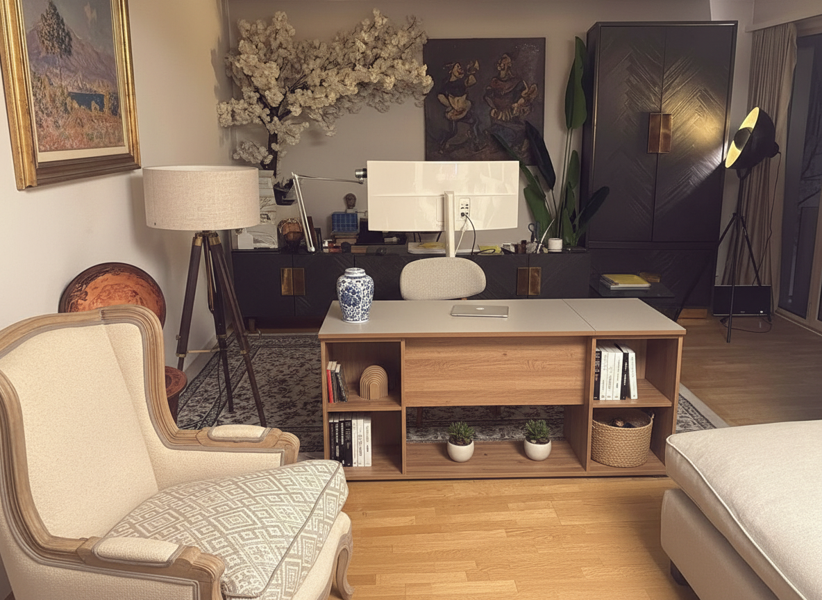 keep the entire room exactly the same lighting furniture decorations plants lamps artwork cabinet rug and colors only modify the desk orientation rotate the wooden desk 90 degrees so it is vertical and pushed against the wall with the back of the desk touching the wall the desk should no longer face the room everything else in the scene remains unchanged negative constraint prompt recommended do not change lighting camera angle floor lamp position chairs cabinet plants artwork rug colors or room layout only rotate and reposition the desk