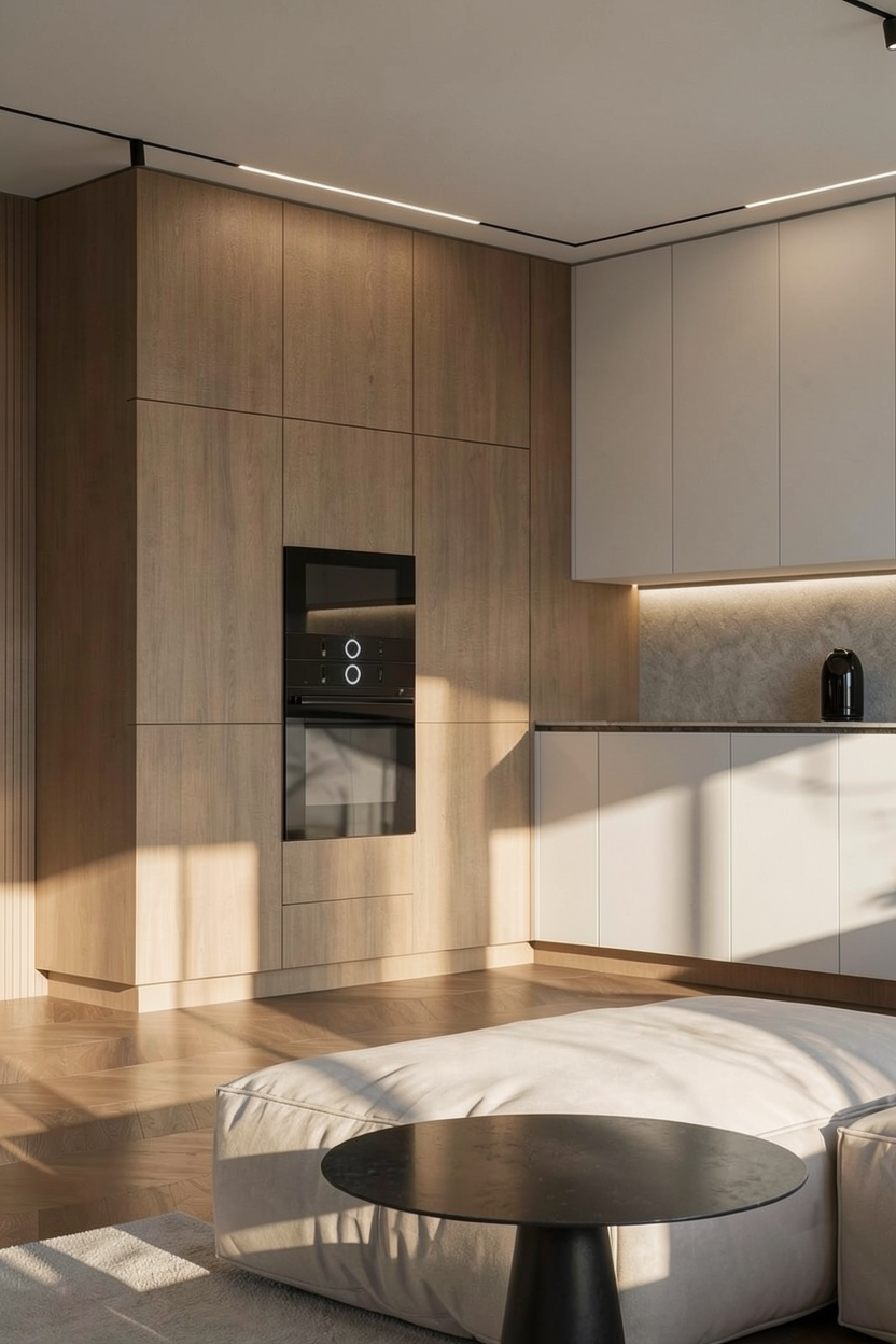 convert this floor plan into a realistic isometric 3d view of a full house show the space from an elevated angle with furniture walls and details visible office floor plan rendered in a luxurious and modern style with warm lighting creating a cozy atmosphere use sleek wooden floors in a rich walnut color soft cream walls and minimalistic elegant black furniture incorporate large glass windows with abundant natural light illuminating the space add touches of greenery with lush indoor plants the kitchen should feature stainless steel appliances and marble countertops in light gray include an inviting entrance with a contemporary chandelier use the same furniture as shows on the plan do not change the orientation of the floorplan