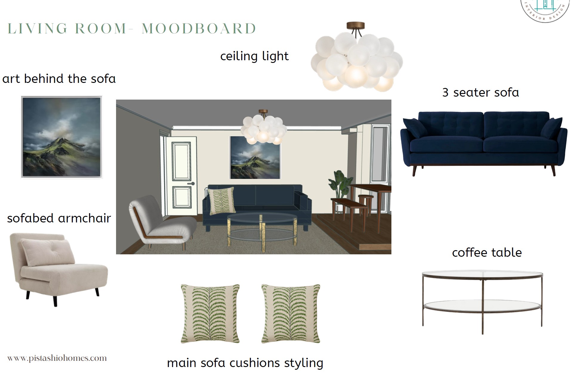 interior shot i have uploaded an image which includes the exact furniture that will be used to furnish the room i need a render with day light view maintain colours use the exact furniture and render the image from the concept and moodboard the document also contains a sketchup sketch of the room and the view i am looking for sofa is a velvet texture wood flooring glass coffee table boucle armchair walls and ceiling in portland stone 77 from little green skirting in pompein ash little green