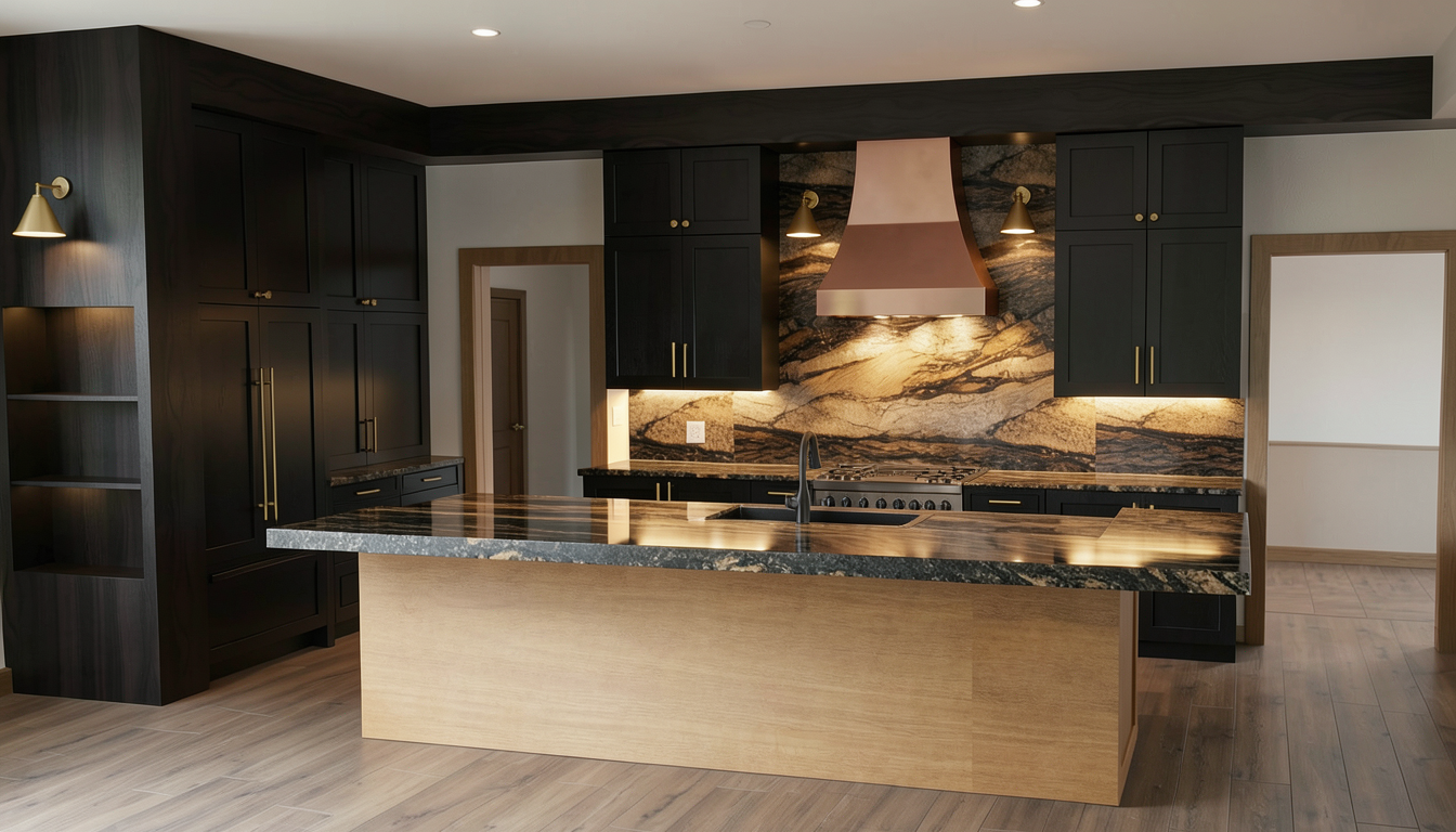 scene preservation critical use the provided sketchup model exactly as is do not redesign simplify or reinterpret geometry maintain all cabinet layouts proportions door styles trim backsplash hood shape and island structure exactly as shown strict material assignment do not override geometry vertical surfaces all cabinetry perimeter cabinets deep black stained wood with visible grain not painted not flat black island base medium caramel wood tone with natural grain and warmth tall paneling trim match island wood tone horizontal surfaces only countertops apply polished exotic granite titanium gold style only to countertop surfaces do not apply granite to island sides cabinet faces or any vertical surfaces important rule stone granite horizontal planes only wood vertical cabinetry only countertop description apply only to tops polished exotic granite with dramatic horizontal flowing veins deep charcoal black warm brown bronze and gold tones organic layered movement with high contrast medium to large scale veining subtle polished finish not overly glossy natural stone variation with fine mineral detail hood fixtures range hood brushed copper with soft natural patina keep exact shape hardware warm brass tones maintain placement doorways both side doorways must open into real interior rooms not blank space use warm cohesive tones wood taupe soft browns no bright white or exterior light slightly dimmer lighting than kitchen lighting overall brighter warm natural interior lighting sconces must cast visible downward light onto backsplash add soft under cabinet glow preserve warmth do not wash out materials preserve these exactly backsplash pattern and color flooring tone and direction cabinet layout and spacing island proportions and overhang all trim architectural details do not turn island into stone do not remove wood grain do not flatten cabinet color to pure black do not crop cabinetry do not overexpose lighting do not simplify materials photorealistic render using existing model geometry high resolution pbr materials accurate scale global illumination realistic shadows interior architectural photography style the island contains two distinct countertop levels stepped design maintain both levels exactly as modeled do not merge flatten or simplify into one surface preserve all height differences edges thicknesses and overhangs each surface must remain independent and clearly defined primary countertop lower level material polished exotic granite titanium gold style applies to all standard countertop surfaces secondary countertop upper level material solid wood slab 2 inch thick medium caramel tone with visible natural grain this is a raised separate surface above the granite