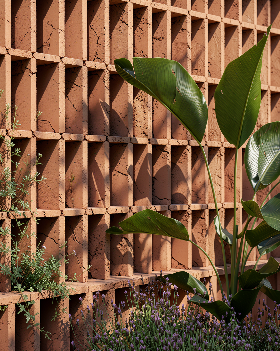 make this image more realistic preserving composition and geometry improve vegetation with natural variation and organic tones refine clay texture subtle roughness and soft tonal variation avoid excessive cracks or damage define the lattice as individual clay pieces with visible joints not a single surface keep everything in the same plane no changes in volume or depth