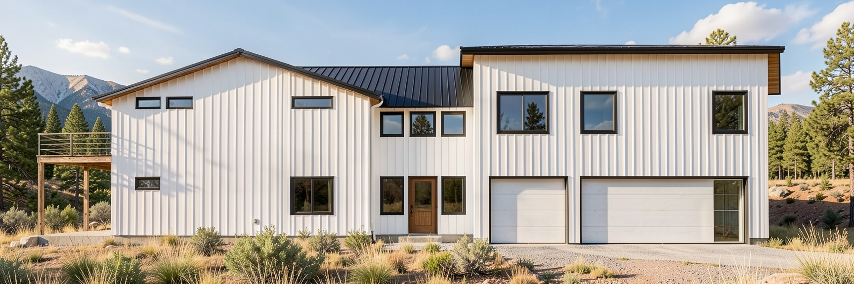 render the exterior make the house white and the roof black put the scene in montana
