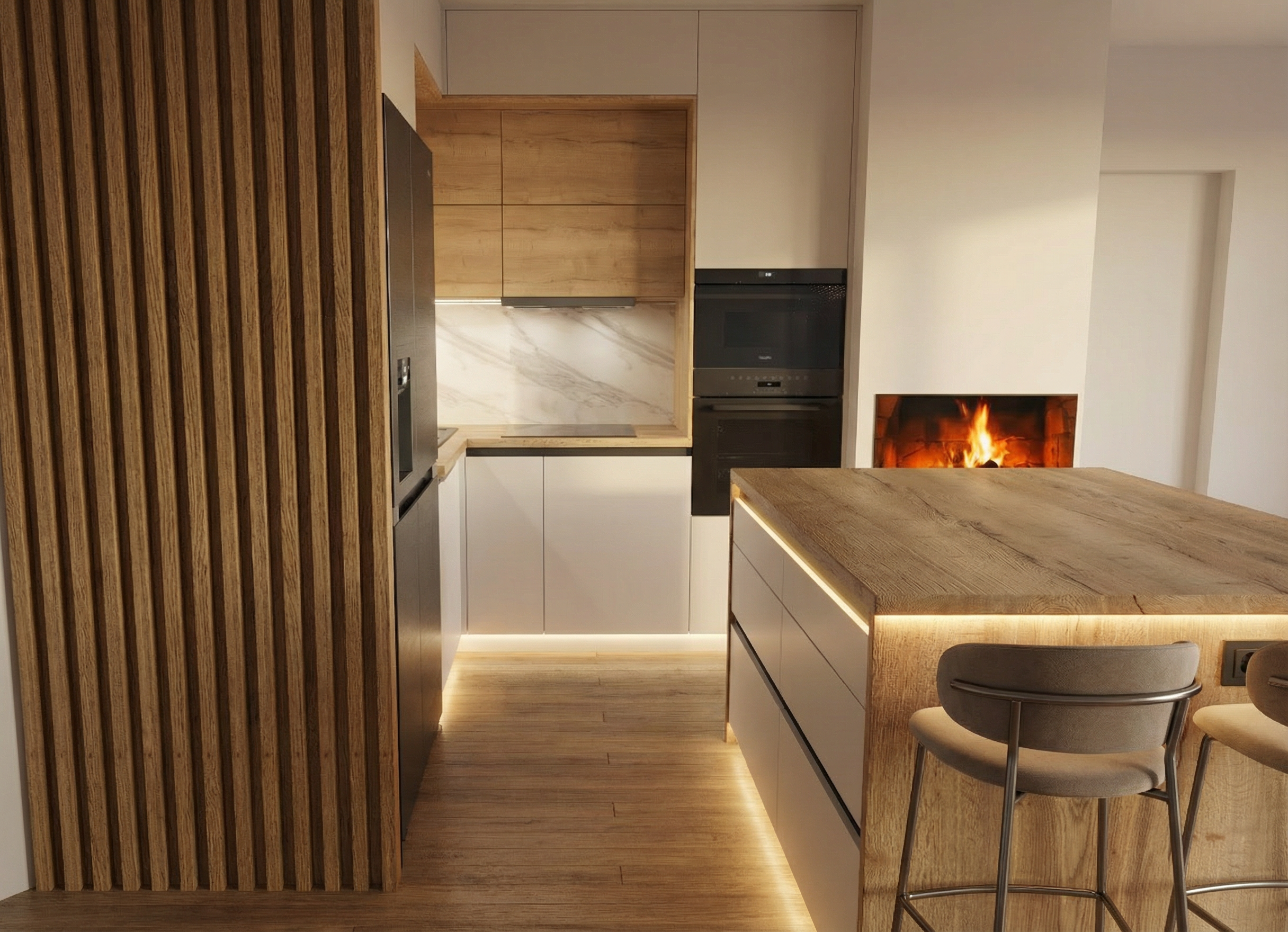 genau dieses rendering berarbeiten fotorealistisches innenraum foto exakt dieselbe perspektive und kameraposition wie das hochgeladene referenzbild 100 identische raumgeometrie exakt gleiche m belanordnung exakt gleiche verlegeart und richtung von parket und platten wie vorlage parket ruhig und hellgrau weiches nat rliches tageslicht raum k nstlich ausleuchten sanfte realistische schatten realistische materialien stoff mit leichten gebrauchsspuren hochwertige oberfl chenreflexionen lavabo komplett aus marmor collemandina grigio in braungrau dunkel lavabo innen ebenfalls collemandina im unterbau im obersten drittel eine griffmulde ber die ganze breite ganzer unterbau in collemandina unterbaum bel mit unterbaubeleuchtung dahinter eine gessi wandarmatur edelstahl vollkommen rahmenloser und hinterleuchteter spiegel mit echten spiegelungen alle sichtbaren w nde sind sichtbeton schwarze steckdose rechts vom lavabo auf gleicher h he wie die armaturen schwarze runde deckenspots im bad und im zimmer bett wie vorlage modern mit kopfteil aus beigem abgestepptem stoffbezug mittig im raum parket im zimmer ruhig und hellgrau boden im badbereich collemandina grigio in braungrau links vor der wand zum bad ein grau get ntes durchscheinendes glas zum schieben an grossen rollen aus edelstahl oben ber die ganze breite aufgeh ngt gr sse die dunklere fl che in der vorlage fassade aussen aus hellgrauem klinker sehr moderner minimalistischer look nat rliche farbwiedergabe golden hour feeling hell ausleuchten das bild muss wie eine professionelle fotografie aussehen es soll ein echtes und reales foto sein canon eos r5 35 mm festbrennweite f 2 8 hyperrealistisch dslr qualit t raw aufnahme 8k aufl sung extrem scharf perfekte tiefensch rfe professionelle architekturfotografie