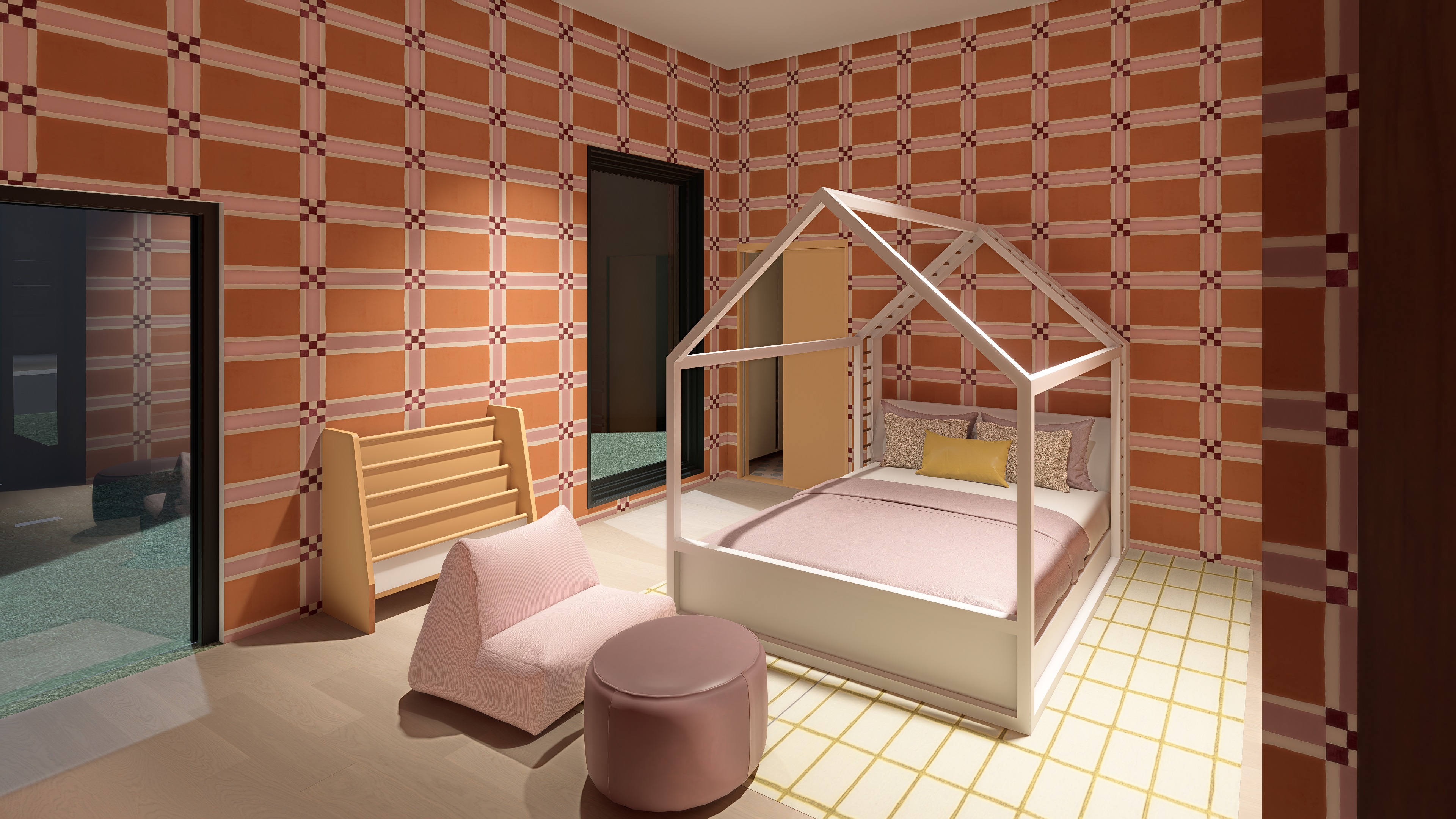 render a cozy children s bedroom with a modern playful atmosphere the walls feature an orange and pink checkered pattern with small red accents the main piece is a unique white house frame bed with a soft pink duvet and pillows in shades of pink gray and a pop of yellow for contrast a light wooden floor adds warmth covered partially by a cream and yellow grid pattern rug there s a pastel pink lounge chair and a mauve round ottoman a wooden toy shelf against the wall brings in a subtle natural element large windows on the left allow soft daylight to fill the room creating a tranquil and inviting space showing a green grass garden with a green tree and bushes